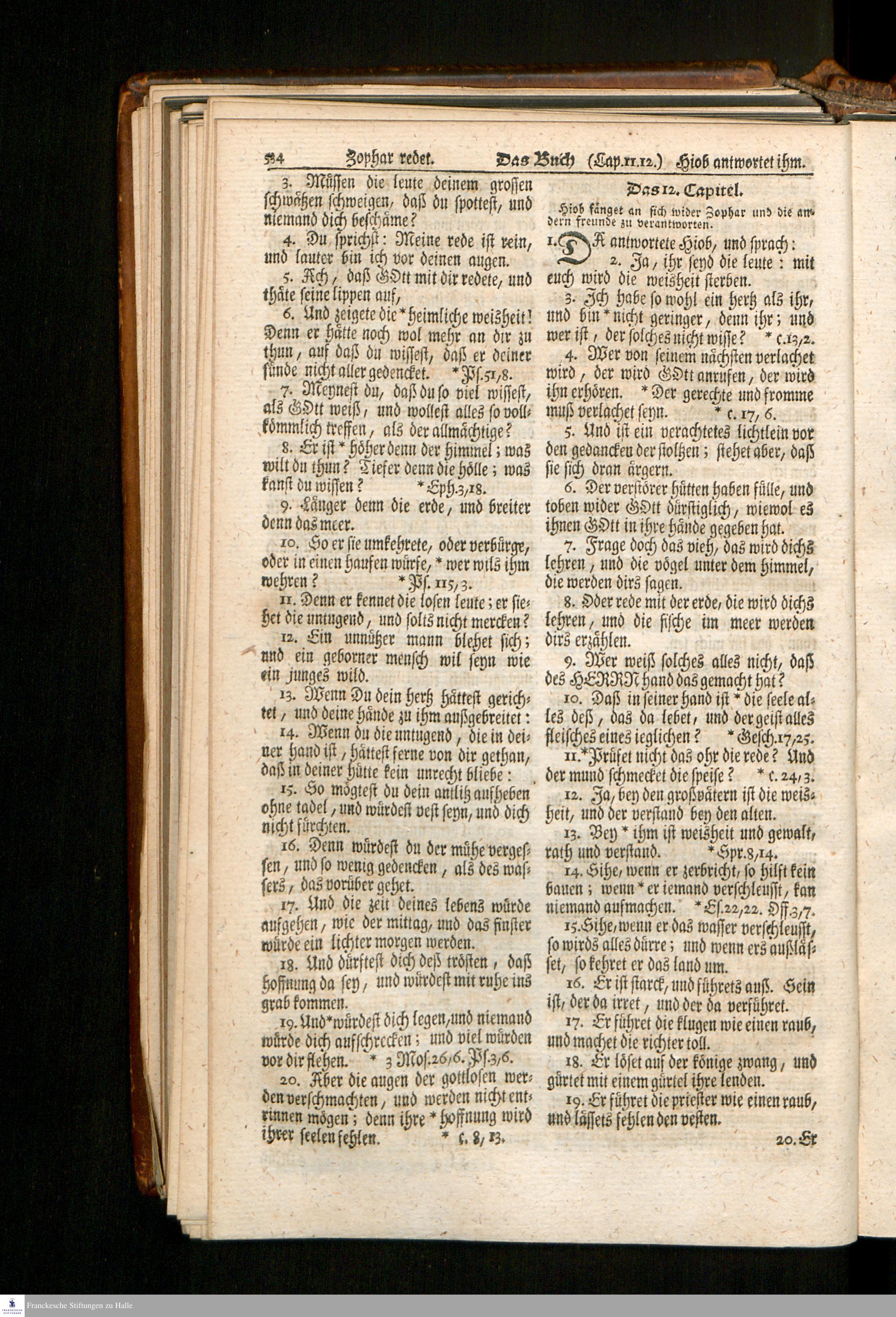 Biblia, Das ist: Die gantze Heil. Schrift Altes und Neues Testaments / Nach der Teutschen Ubersetzung D. Martin Luthers; Mit iedes Capitels kurtzen Summarien, auch beygefügten vielen und richtigen Parallelen; Mit fleiß übersehen/ und gegen einige/ sonderlich erstere/ Editiones des sel. Mannes gehalten, auch an unterschiedlichen Orten nach denselben eingerichtet, und von vielen in den bisherigen Exemplarien hin und wieder eingeschlichenen Fehlern gesaubert. Nebst einer Vorrede Herrn Baron Carl Hildebrands von Canstein