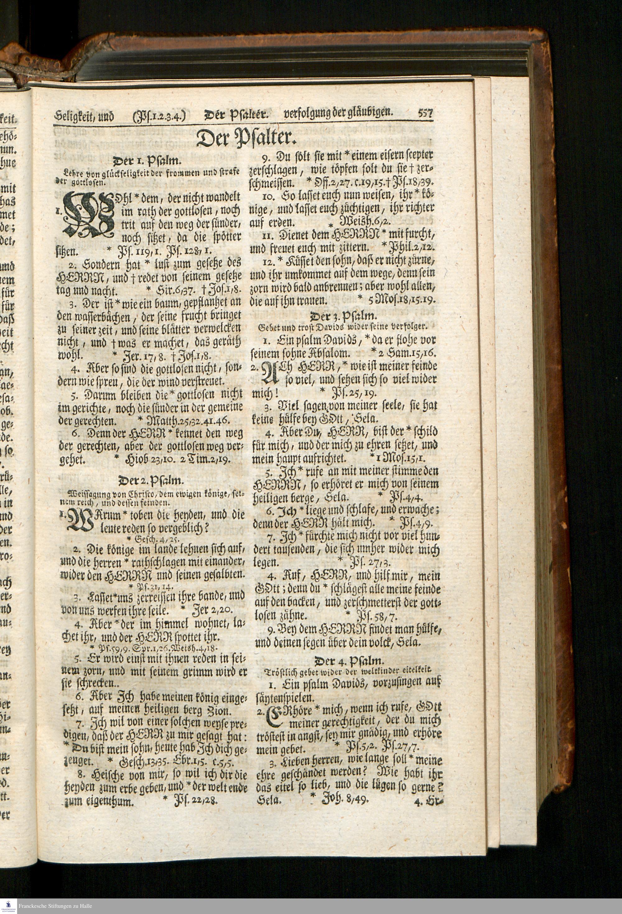Biblia, Das ist: Die gantze Heil. Schrift Altes und Neues Testaments / Nach der Teutschen Ubersetzung D. Martin Luthers; Mit iedes Capitels kurtzen Summarien, auch beygefügten vielen und richtigen Parallelen; Mit fleiß übersehen/ und gegen einige/ sonderlich erstere/ Editiones des sel. Mannes gehalten, auch an unterschiedlichen Orten nach denselben eingerichtet, und von vielen in den bisherigen Exemplarien hin und wieder eingeschlichenen Fehlern gesaubert. Nebst einer Vorrede Herrn Baron Carl Hildebrands von Canstein