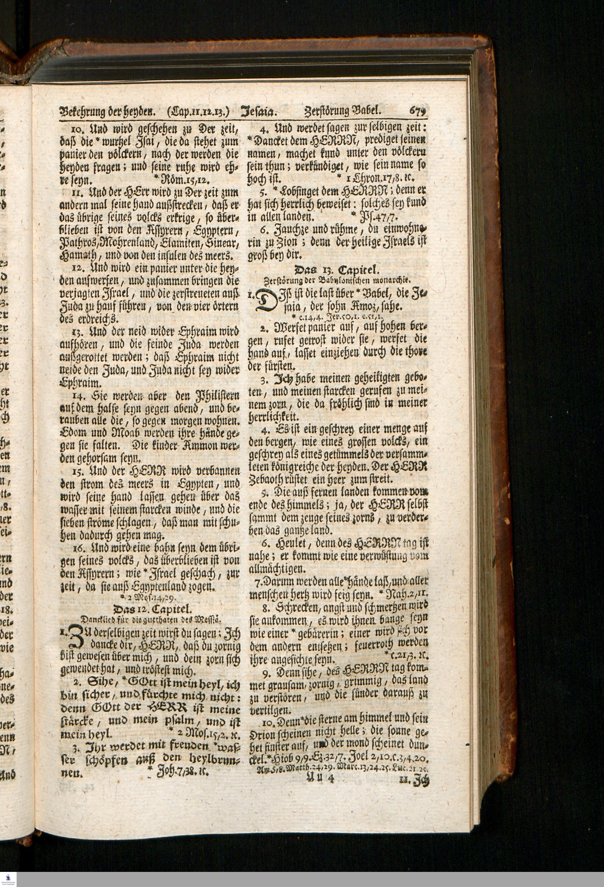 Biblia, Das ist: Die gantze Heil. Schrift Altes und Neues Testaments / Nach der Teutschen Ubersetzung D. Martin Luthers; Mit iedes Capitels kurtzen Summarien, auch beygefügten vielen und richtigen Parallelen; Mit fleiß übersehen/ und gegen einige/ sonderlich erstere/ Editiones des sel. Mannes gehalten, auch an unterschiedlichen Orten nach denselben eingerichtet, und von vielen in den bisherigen Exemplarien hin und wieder eingeschlichenen Fehlern gesaubert. Nebst einer Vorrede Herrn Baron Carl Hildebrands von Canstein