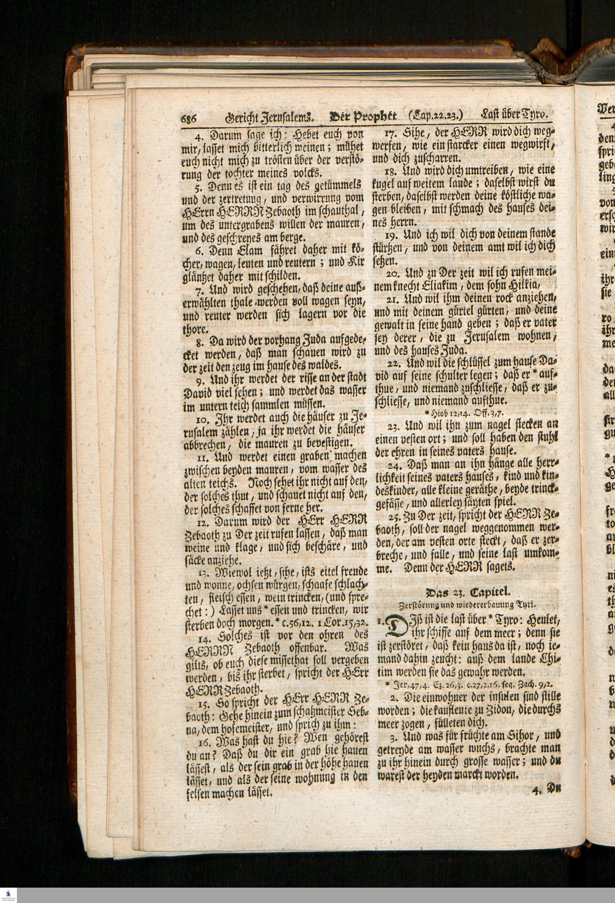 Biblia, Das ist: Die gantze Heil. Schrift Altes und Neues Testaments / Nach der Teutschen Ubersetzung D. Martin Luthers; Mit iedes Capitels kurtzen Summarien, auch beygefügten vielen und richtigen Parallelen; Mit fleiß übersehen/ und gegen einige/ sonderlich erstere/ Editiones des sel. Mannes gehalten, auch an unterschiedlichen Orten nach denselben eingerichtet, und von vielen in den bisherigen Exemplarien hin und wieder eingeschlichenen Fehlern gesaubert. Nebst einer Vorrede Herrn Baron Carl Hildebrands von Canstein