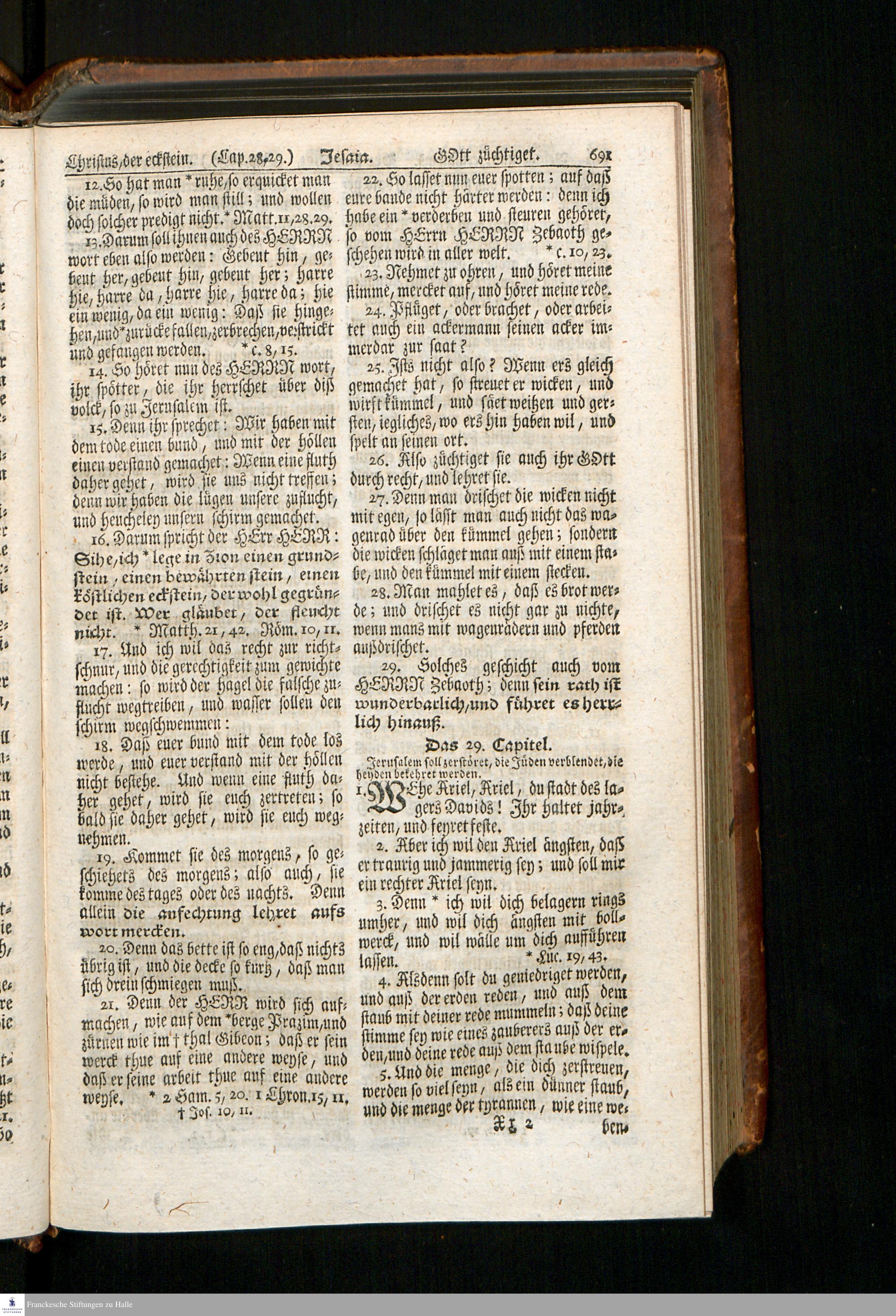 Biblia, Das ist: Die gantze Heil. Schrift Altes und Neues Testaments / Nach der Teutschen Ubersetzung D. Martin Luthers; Mit iedes Capitels kurtzen Summarien, auch beygefügten vielen und richtigen Parallelen; Mit fleiß übersehen/ und gegen einige/ sonderlich erstere/ Editiones des sel. Mannes gehalten, auch an unterschiedlichen Orten nach denselben eingerichtet, und von vielen in den bisherigen Exemplarien hin und wieder eingeschlichenen Fehlern gesaubert. Nebst einer Vorrede Herrn Baron Carl Hildebrands von Canstein