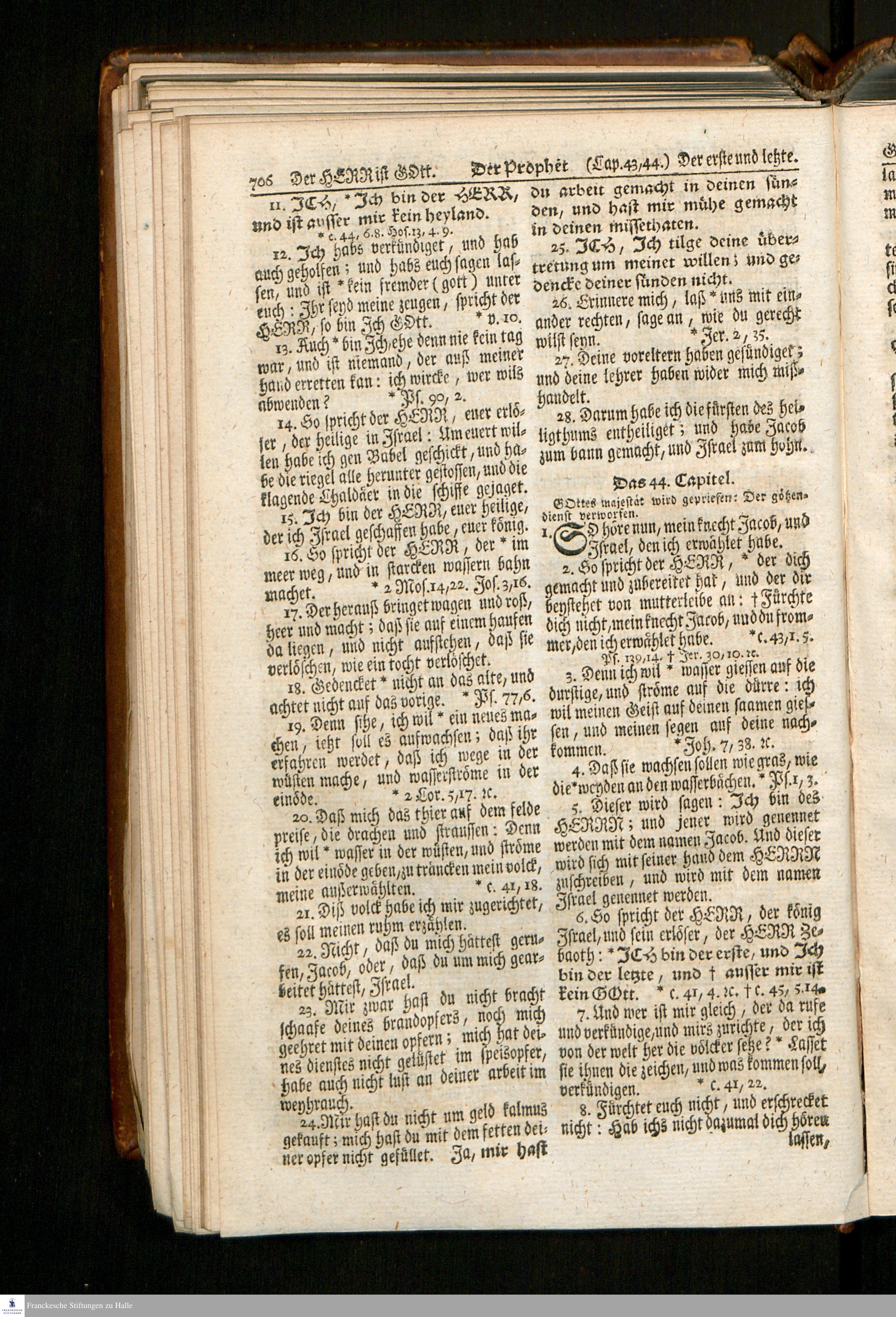 Biblia, Das ist: Die gantze Heil. Schrift Altes und Neues Testaments / Nach der Teutschen Ubersetzung D. Martin Luthers; Mit iedes Capitels kurtzen Summarien, auch beygefügten vielen und richtigen Parallelen; Mit fleiß übersehen/ und gegen einige/ sonderlich erstere/ Editiones des sel. Mannes gehalten, auch an unterschiedlichen Orten nach denselben eingerichtet, und von vielen in den bisherigen Exemplarien hin und wieder eingeschlichenen Fehlern gesaubert. Nebst einer Vorrede Herrn Baron Carl Hildebrands von Canstein