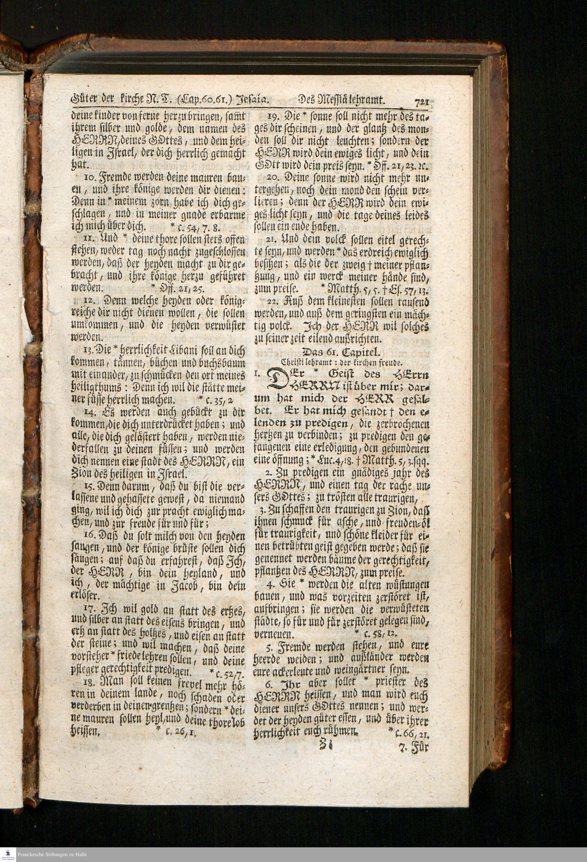 Biblia, Das ist: Die gantze Heil. Schrift Altes und Neues Testaments / Nach der Teutschen Ubersetzung D. Martin Luthers; Mit iedes Capitels kurtzen Summarien, auch beygefügten vielen und richtigen Parallelen; Mit fleiß übersehen/ und gegen einige/ sonderlich erstere/ Editiones des sel. Mannes gehalten, auch an unterschiedlichen Orten nach denselben eingerichtet, und von vielen in den bisherigen Exemplarien hin und wieder eingeschlichenen Fehlern gesaubert. Nebst einer Vorrede Herrn Baron Carl Hildebrands von Canstein