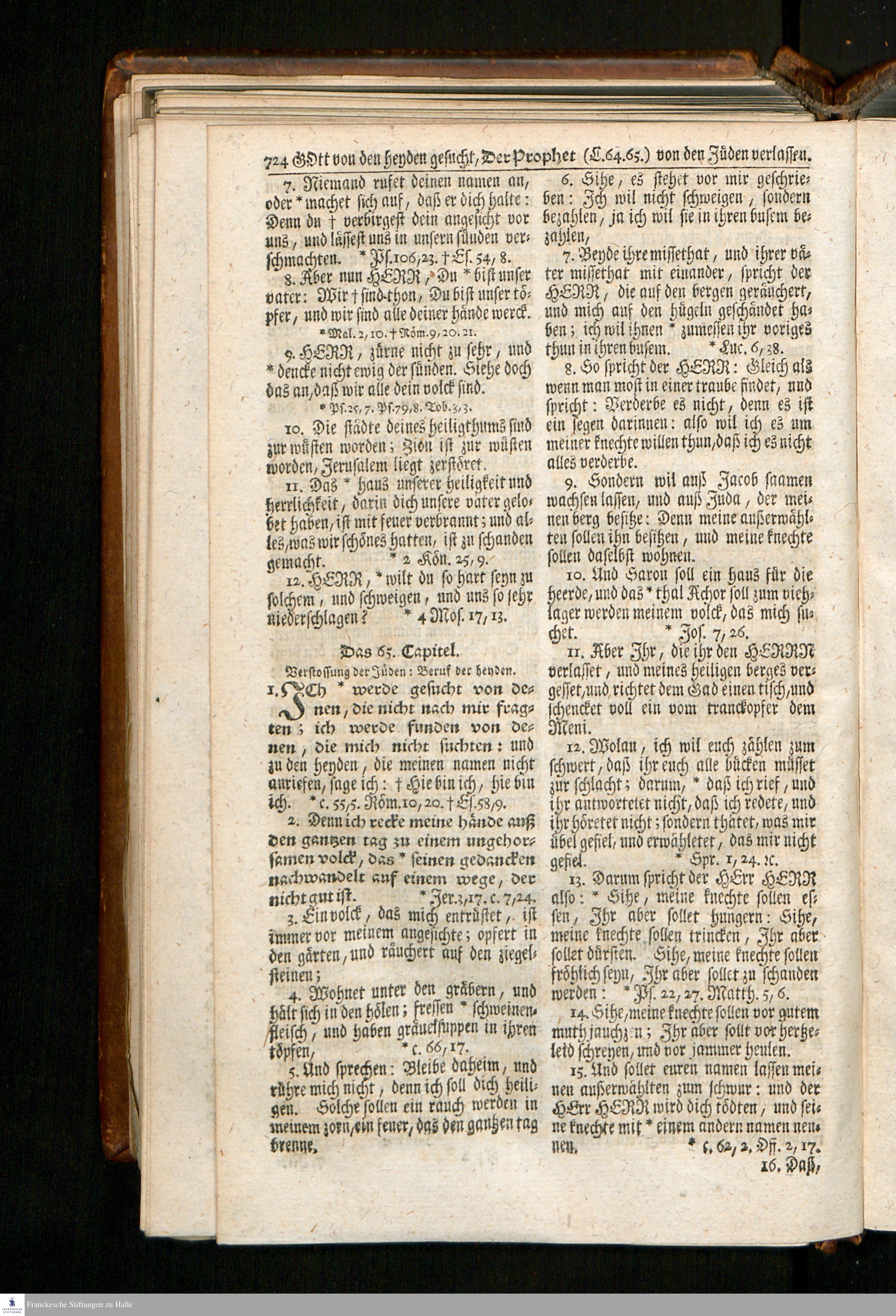 Biblia, Das ist: Die gantze Heil. Schrift Altes und Neues Testaments / Nach der Teutschen Ubersetzung D. Martin Luthers; Mit iedes Capitels kurtzen Summarien, auch beygefügten vielen und richtigen Parallelen; Mit fleiß übersehen/ und gegen einige/ sonderlich erstere/ Editiones des sel. Mannes gehalten, auch an unterschiedlichen Orten nach denselben eingerichtet, und von vielen in den bisherigen Exemplarien hin und wieder eingeschlichenen Fehlern gesaubert. Nebst einer Vorrede Herrn Baron Carl Hildebrands von Canstein