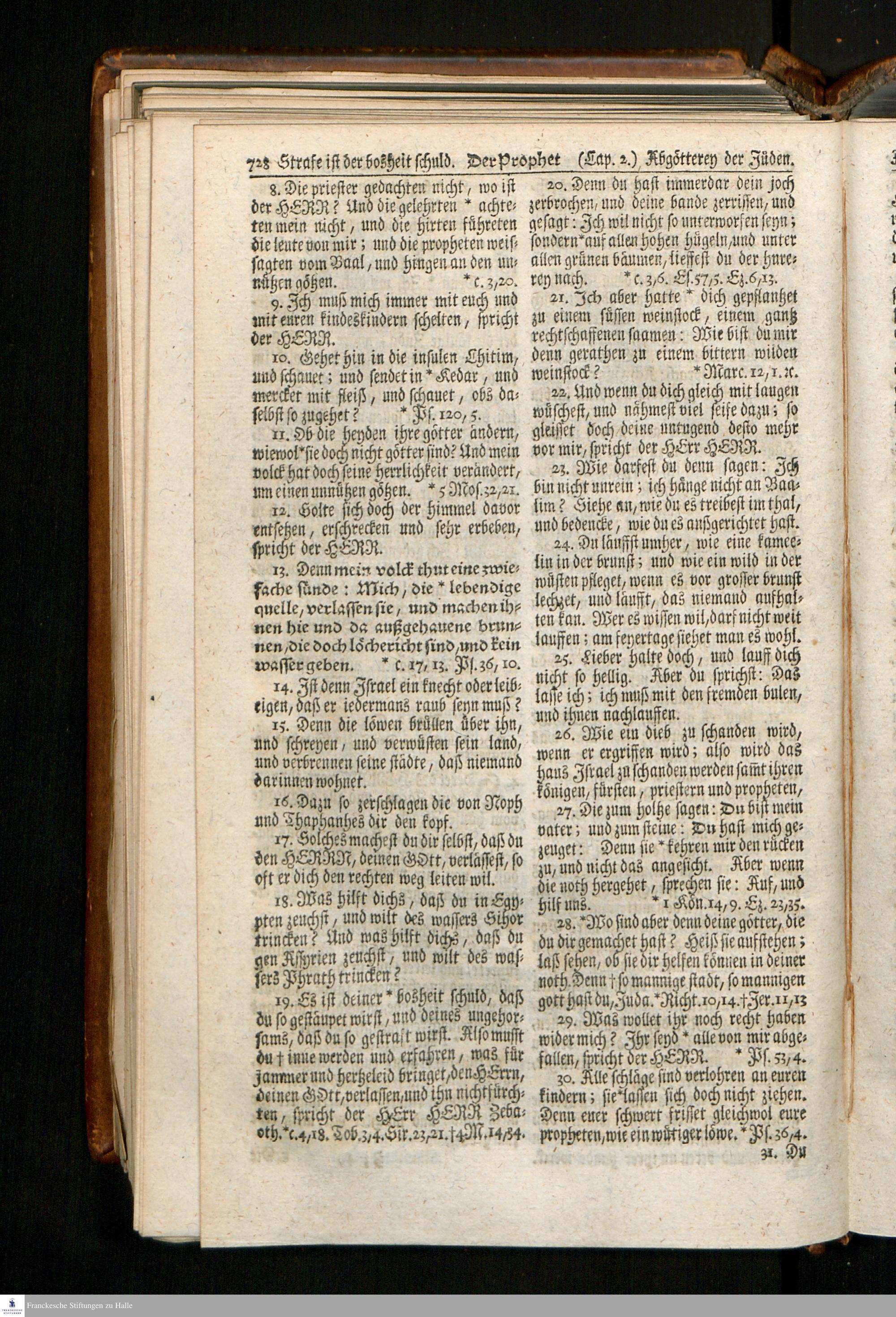 Biblia, Das ist: Die gantze Heil. Schrift Altes und Neues Testaments / Nach der Teutschen Ubersetzung D. Martin Luthers; Mit iedes Capitels kurtzen Summarien, auch beygefügten vielen und richtigen Parallelen; Mit fleiß übersehen/ und gegen einige/ sonderlich erstere/ Editiones des sel. Mannes gehalten, auch an unterschiedlichen Orten nach denselben eingerichtet, und von vielen in den bisherigen Exemplarien hin und wieder eingeschlichenen Fehlern gesaubert. Nebst einer Vorrede Herrn Baron Carl Hildebrands von Canstein