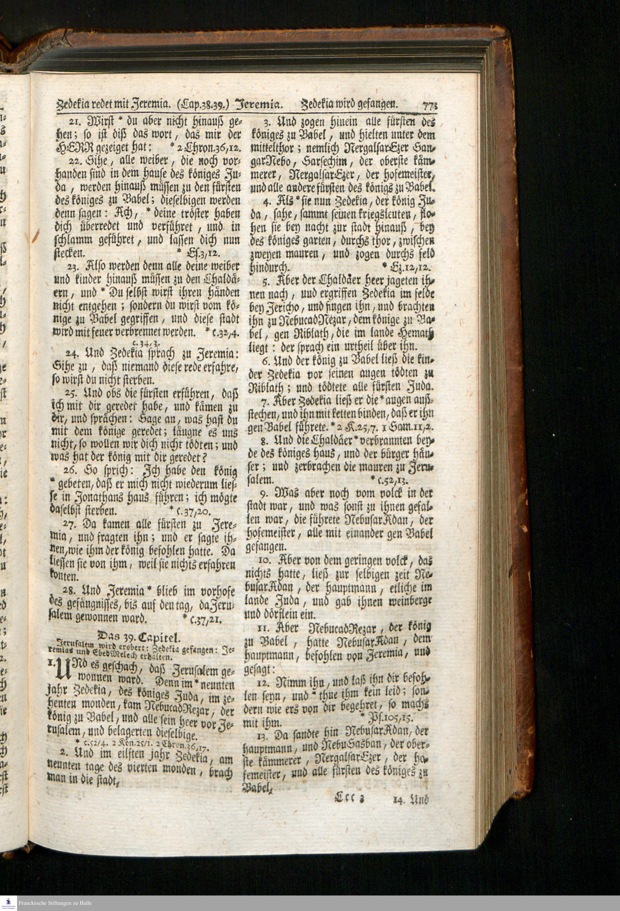 Biblia, Das ist: Die gantze Heil. Schrift Altes und Neues Testaments / Nach der Teutschen Ubersetzung D. Martin Luthers; Mit iedes Capitels kurtzen Summarien, auch beygefügten vielen und richtigen Parallelen; Mit fleiß übersehen/ und gegen einige/ sonderlich erstere/ Editiones des sel. Mannes gehalten, auch an unterschiedlichen Orten nach denselben eingerichtet, und von vielen in den bisherigen Exemplarien hin und wieder eingeschlichenen Fehlern gesaubert. Nebst einer Vorrede Herrn Baron Carl Hildebrands von Canstein