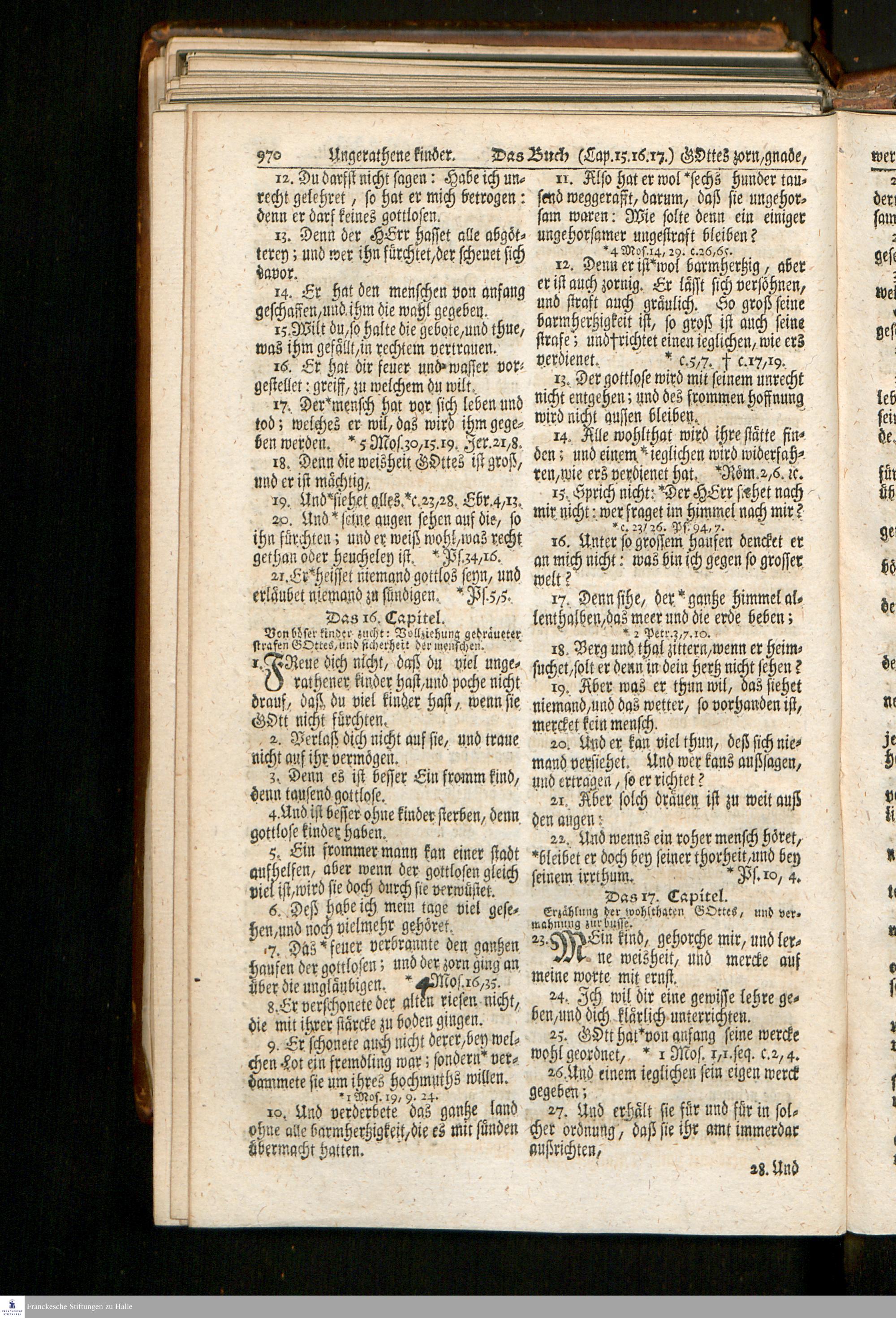 Biblia, Das ist: Die gantze Heil. Schrift Altes und Neues Testaments / Nach der Teutschen Ubersetzung D. Martin Luthers; Mit iedes Capitels kurtzen Summarien, auch beygefügten vielen und richtigen Parallelen; Mit fleiß übersehen/ und gegen einige/ sonderlich erstere/ Editiones des sel. Mannes gehalten, auch an unterschiedlichen Orten nach denselben eingerichtet, und von vielen in den bisherigen Exemplarien hin und wieder eingeschlichenen Fehlern gesaubert. Nebst einer Vorrede Herrn Baron Carl Hildebrands von Canstein