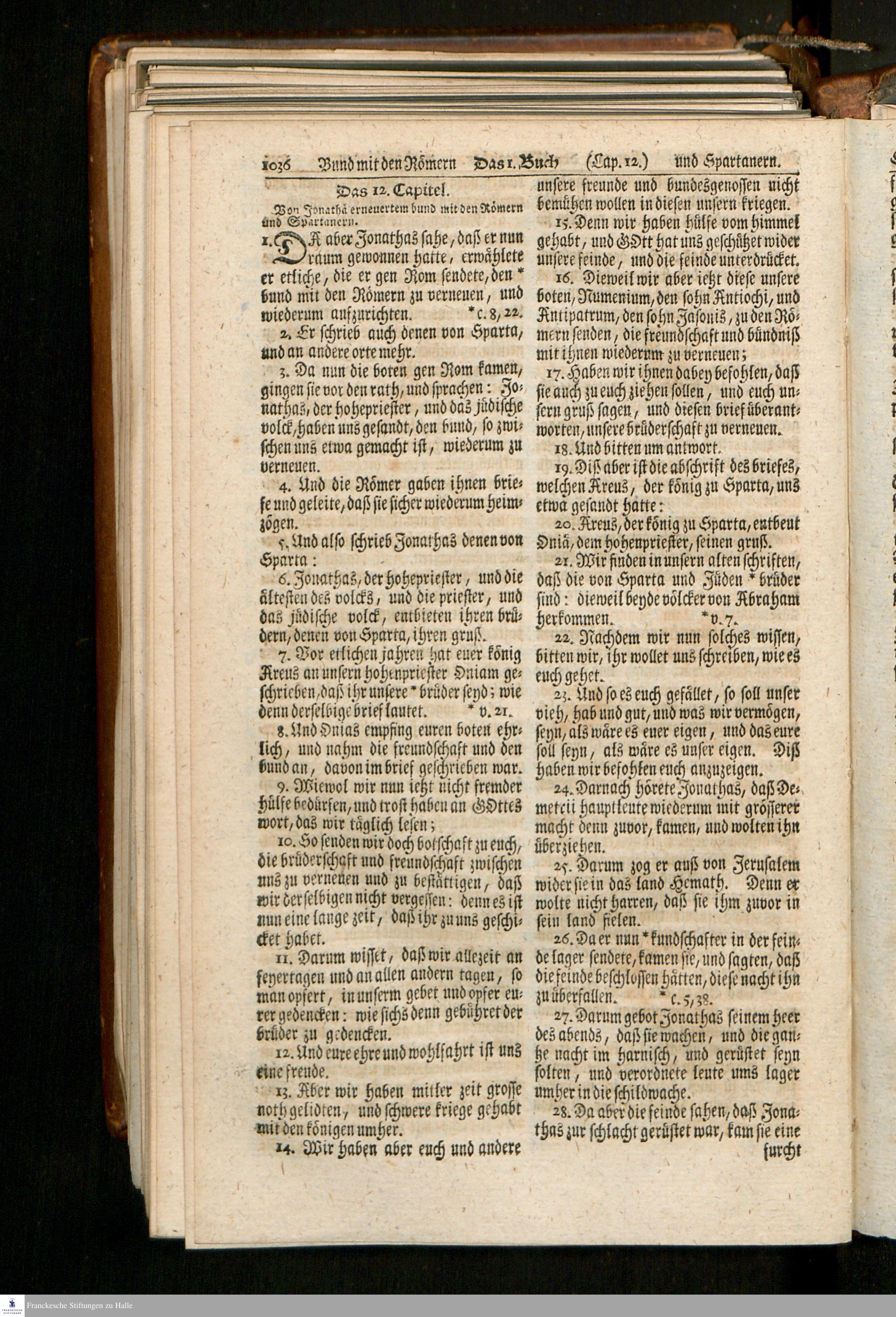 Biblia, Das ist: Die gantze Heil. Schrift Altes und Neues Testaments / Nach der Teutschen Ubersetzung D. Martin Luthers; Mit iedes Capitels kurtzen Summarien, auch beygefügten vielen und richtigen Parallelen; Mit fleiß übersehen/ und gegen einige/ sonderlich erstere/ Editiones des sel. Mannes gehalten, auch an unterschiedlichen Orten nach denselben eingerichtet, und von vielen in den bisherigen Exemplarien hin und wieder eingeschlichenen Fehlern gesaubert. Nebst einer Vorrede Herrn Baron Carl Hildebrands von Canstein