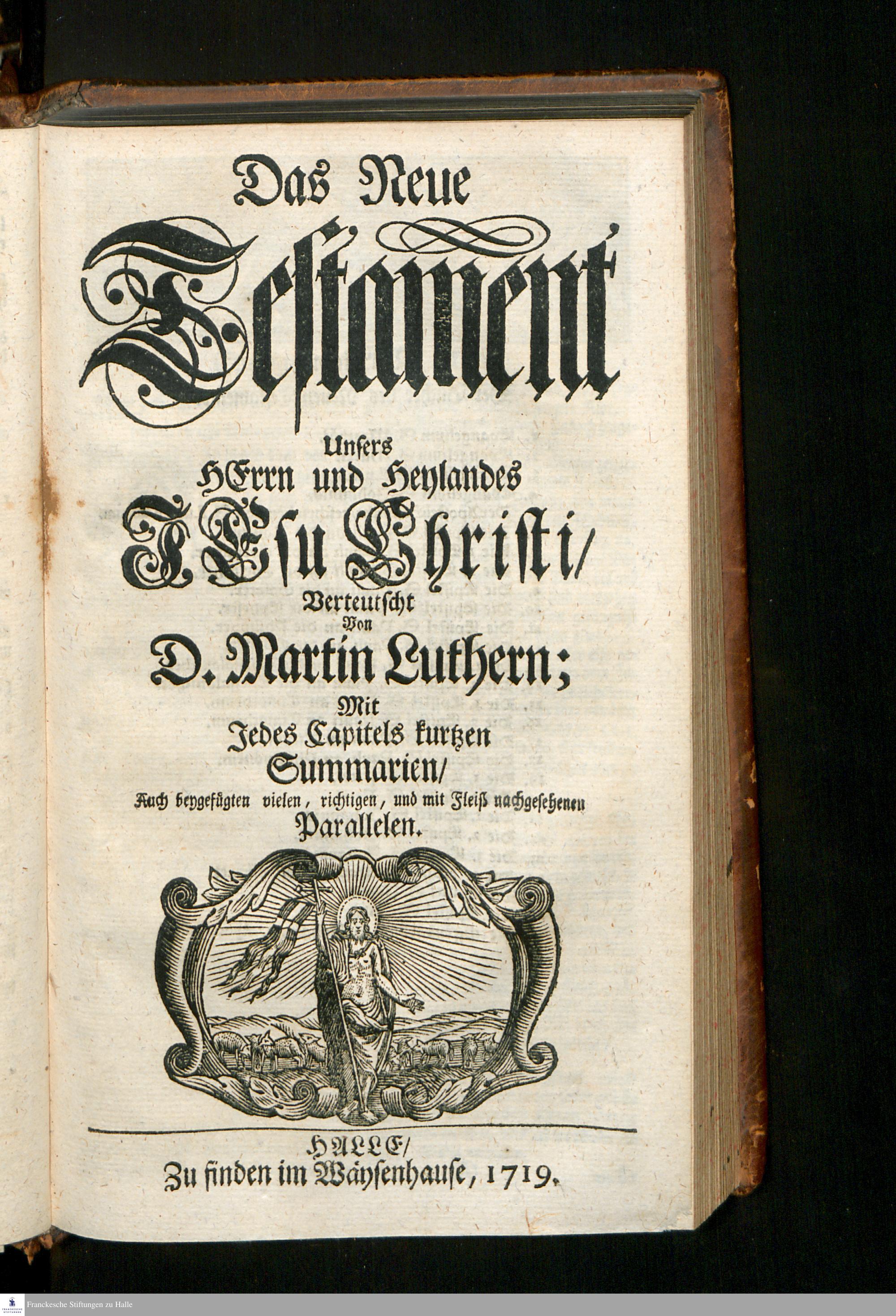 Biblia, Das ist: Die gantze Heil. Schrift Altes und Neues Testaments / Nach der Teutschen Ubersetzung D. Martin Luthers; Mit iedes Capitels kurtzen Summarien, auch beygefügten vielen und richtigen Parallelen; Mit fleiß übersehen/ und gegen einige/ sonderlich erstere/ Editiones des sel. Mannes gehalten, auch an unterschiedlichen Orten nach denselben eingerichtet, und von vielen in den bisherigen Exemplarien hin und wieder eingeschlichenen Fehlern gesaubert. Nebst einer Vorrede Herrn Baron Carl Hildebrands von Canstein