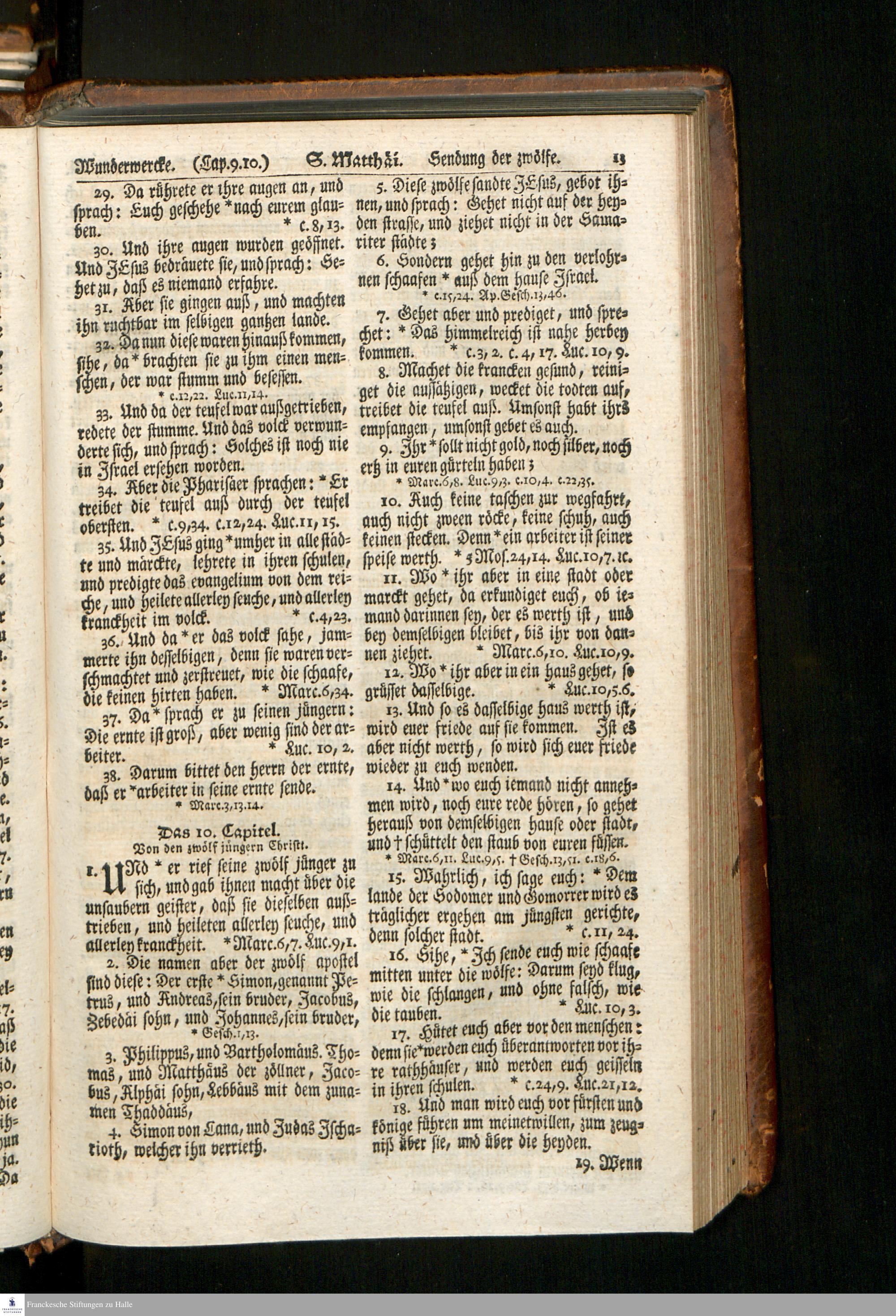 Biblia, Das ist: Die gantze Heil. Schrift Altes und Neues Testaments / Nach der Teutschen Ubersetzung D. Martin Luthers; Mit iedes Capitels kurtzen Summarien, auch beygefügten vielen und richtigen Parallelen; Mit fleiß übersehen/ und gegen einige/ sonderlich erstere/ Editiones des sel. Mannes gehalten, auch an unterschiedlichen Orten nach denselben eingerichtet, und von vielen in den bisherigen Exemplarien hin und wieder eingeschlichenen Fehlern gesaubert. Nebst einer Vorrede Herrn Baron Carl Hildebrands von Canstein
