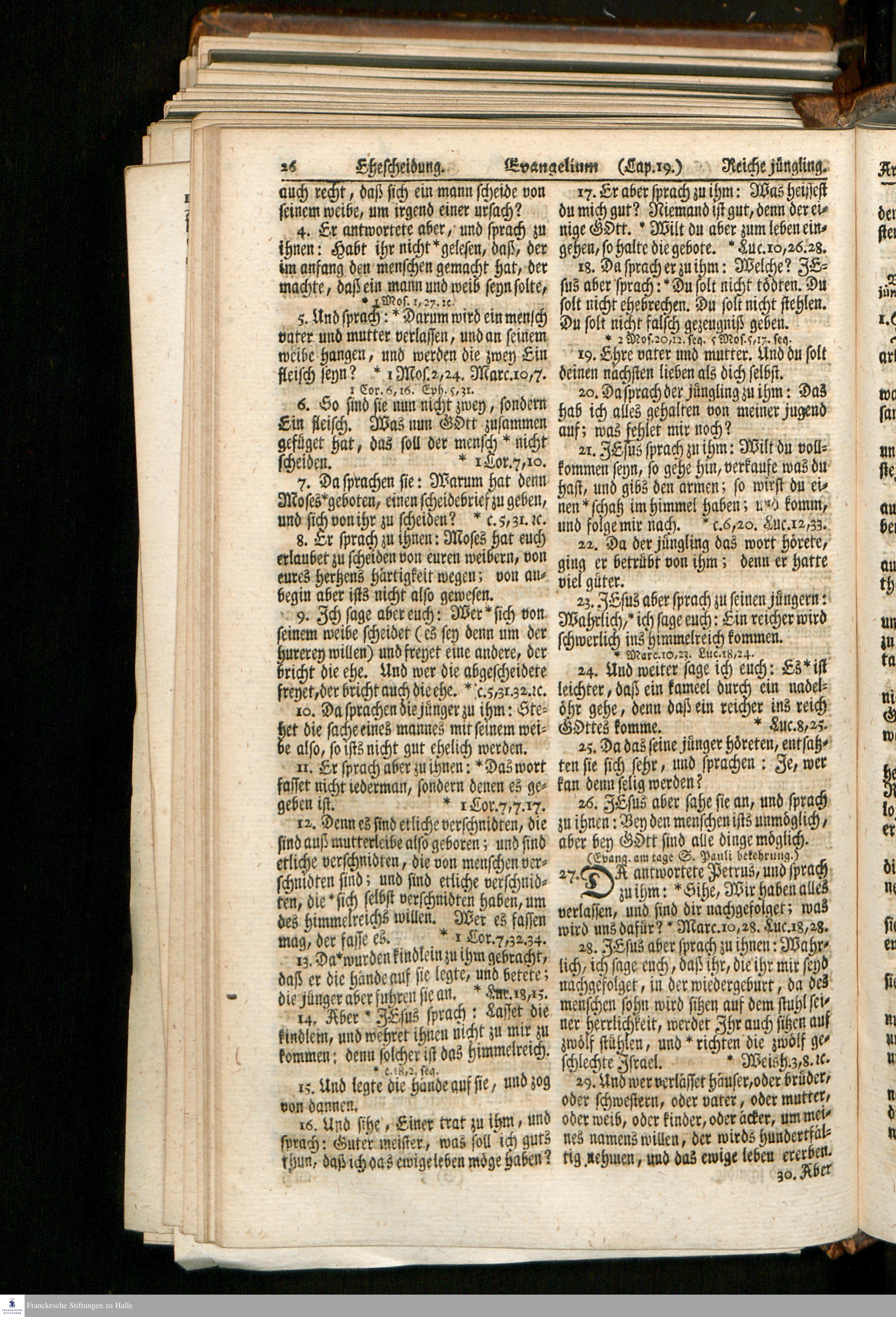 Biblia, Das ist: Die gantze Heil. Schrift Altes und Neues Testaments / Nach der Teutschen Ubersetzung D. Martin Luthers; Mit iedes Capitels kurtzen Summarien, auch beygefügten vielen und richtigen Parallelen; Mit fleiß übersehen/ und gegen einige/ sonderlich erstere/ Editiones des sel. Mannes gehalten, auch an unterschiedlichen Orten nach denselben eingerichtet, und von vielen in den bisherigen Exemplarien hin und wieder eingeschlichenen Fehlern gesaubert. Nebst einer Vorrede Herrn Baron Carl Hildebrands von Canstein