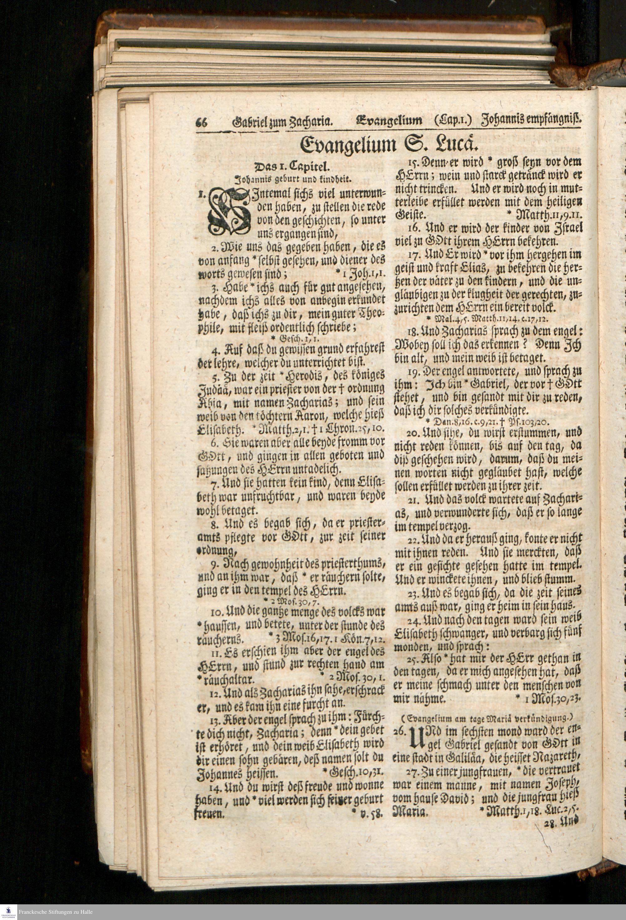 Biblia, Das ist: Die gantze Heil. Schrift Altes und Neues Testaments / Nach der Teutschen Ubersetzung D. Martin Luthers; Mit iedes Capitels kurtzen Summarien, auch beygefügten vielen und richtigen Parallelen; Mit fleiß übersehen/ und gegen einige/ sonderlich erstere/ Editiones des sel. Mannes gehalten, auch an unterschiedlichen Orten nach denselben eingerichtet, und von vielen in den bisherigen Exemplarien hin und wieder eingeschlichenen Fehlern gesaubert. Nebst einer Vorrede Herrn Baron Carl Hildebrands von Canstein