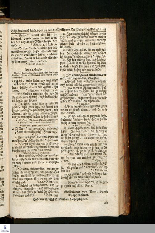 Biblia, Das ist: Die gantze Heil. Schrift Altes und Neues Testaments / Nach der Teutschen Ubersetzung D. Martin Luthers; Mit iedes Capitels kurtzen Summarien, auch beygefügten vielen und richtigen Parallelen; Mit fleiß übersehen/ und gegen einige/ sonderlich erstere/ Editiones des sel. Mannes gehalten, auch an unterschiedlichen Orten nach denselben eingerichtet, und von vielen in den bisherigen Exemplarien hin und wieder eingeschlichenen Fehlern gesaubert. Nebst einer Vorrede Herrn Baron Carl Hildebrands von Canstein