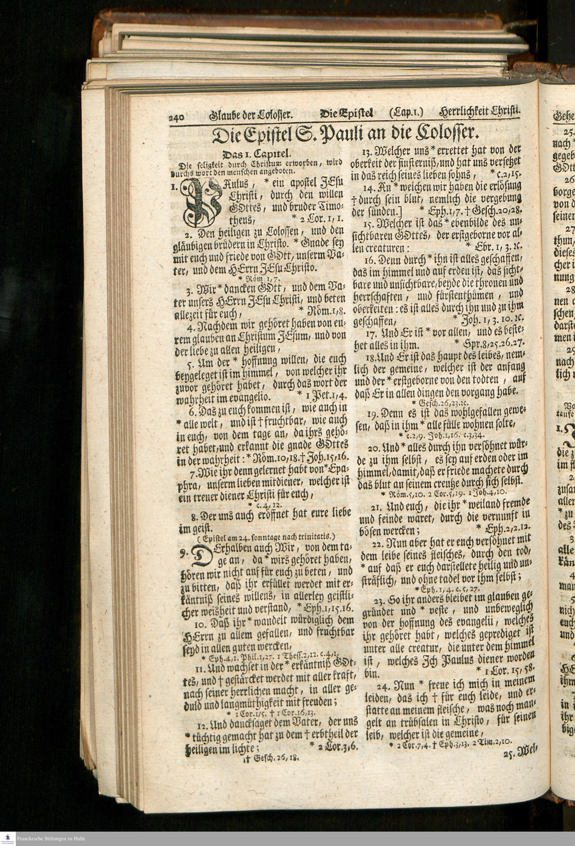 Biblia, Das ist: Die gantze Heil. Schrift Altes und Neues Testaments / Nach der Teutschen Ubersetzung D. Martin Luthers; Mit iedes Capitels kurtzen Summarien, auch beygefügten vielen und richtigen Parallelen; Mit fleiß übersehen/ und gegen einige/ sonderlich erstere/ Editiones des sel. Mannes gehalten, auch an unterschiedlichen Orten nach denselben eingerichtet, und von vielen in den bisherigen Exemplarien hin und wieder eingeschlichenen Fehlern gesaubert. Nebst einer Vorrede Herrn Baron Carl Hildebrands von Canstein
