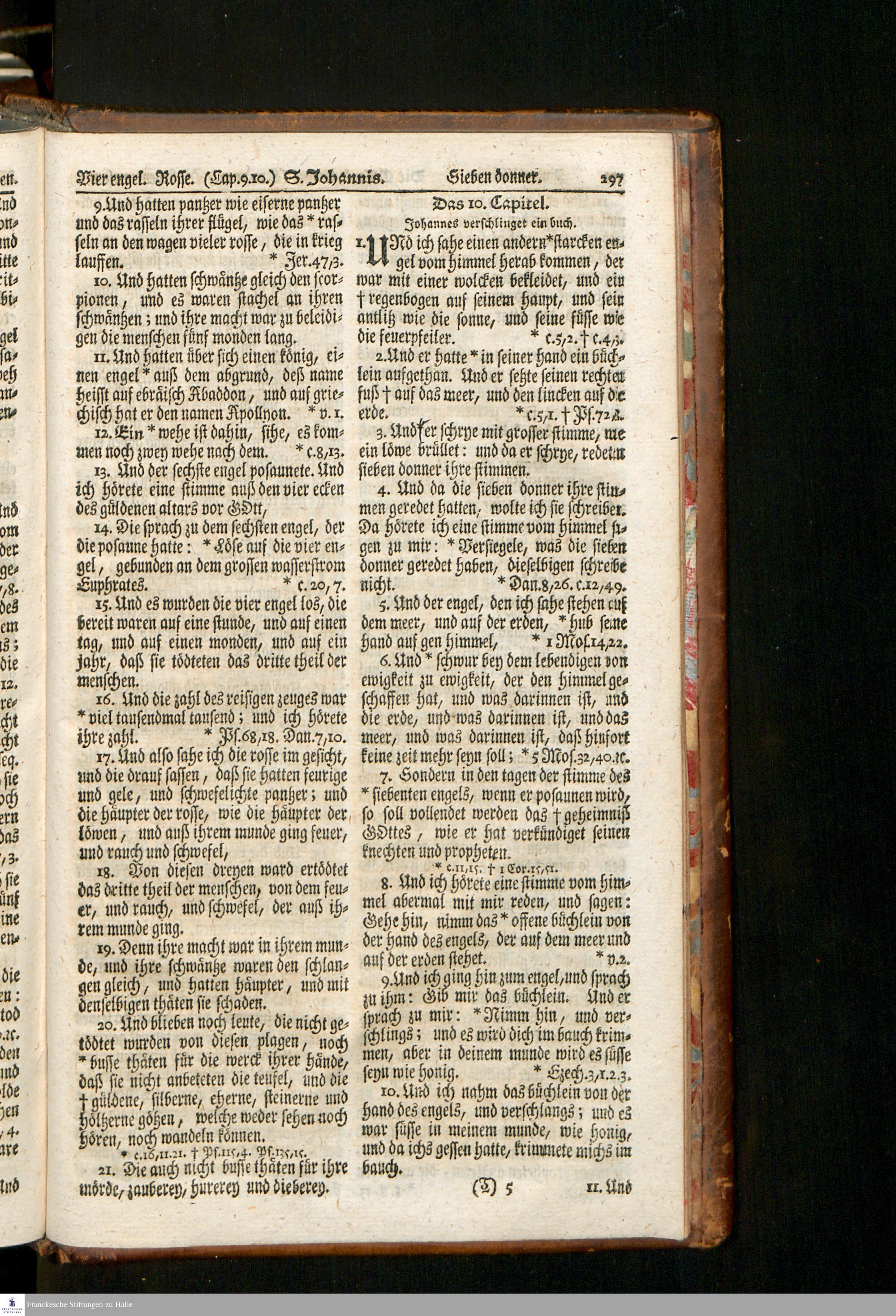 Biblia, Das ist: Die gantze Heil. Schrift Altes und Neues Testaments / Nach der Teutschen Ubersetzung D. Martin Luthers; Mit iedes Capitels kurtzen Summarien, auch beygefügten vielen und richtigen Parallelen; Mit fleiß übersehen/ und gegen einige/ sonderlich erstere/ Editiones des sel. Mannes gehalten, auch an unterschiedlichen Orten nach denselben eingerichtet, und von vielen in den bisherigen Exemplarien hin und wieder eingeschlichenen Fehlern gesaubert. Nebst einer Vorrede Herrn Baron Carl Hildebrands von Canstein