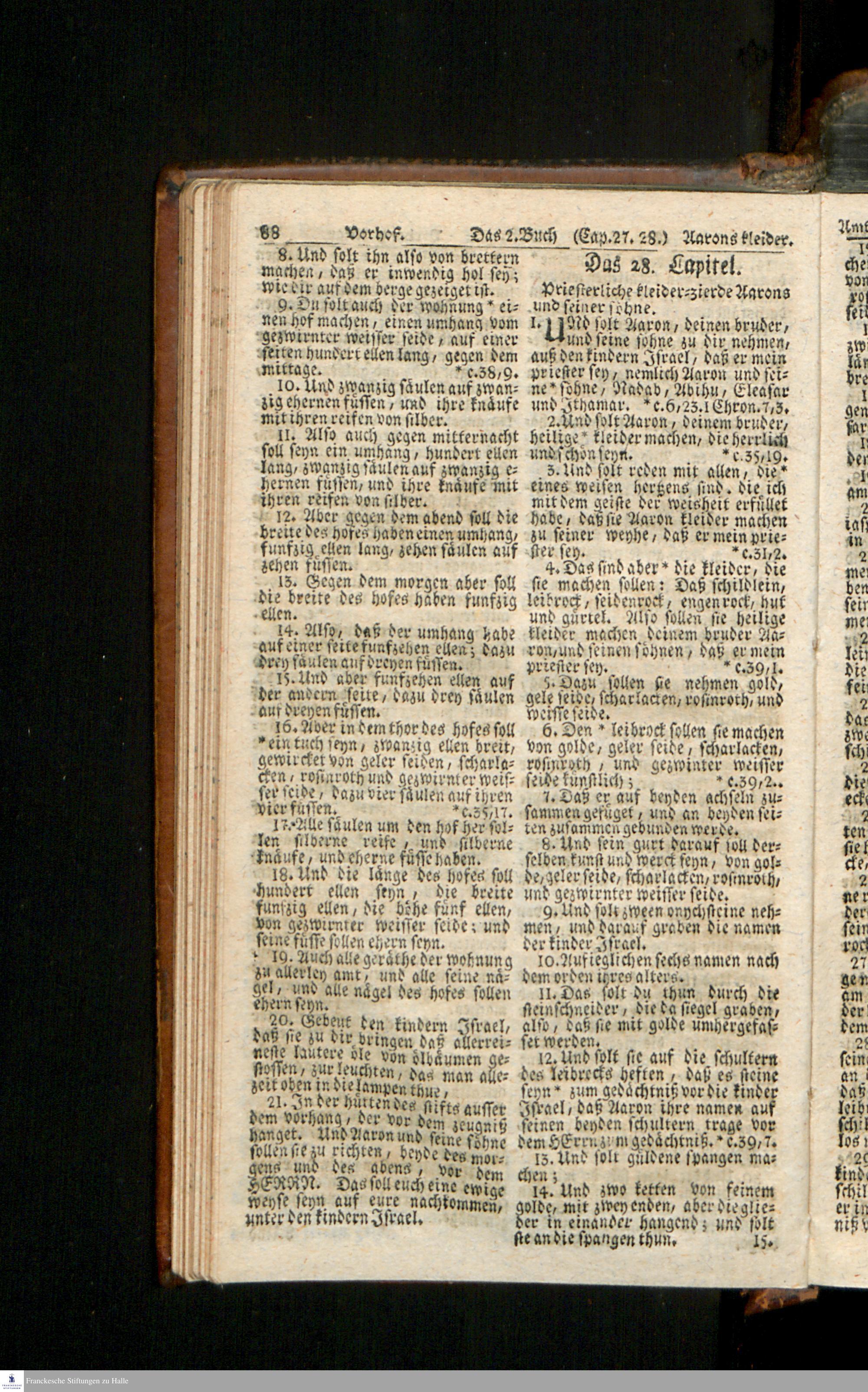 Biblia, Das ist: Die gantze Heil. Schrift Altes und Neues Testaments / Nach der Teutschen Ubersetzung D. Martin Luthers; Mit iedes Capitels kurtzen Summarien/ auch beygefügten vielen und richtigen Parallelen; Mit Fleiß übersehen, Und gegen einige/ sonderlich erstere/ Editiones des sel. Mannes gehalten, auch an unterschiedlichen Orten nach denselben eingerichtet, und von vielen in den bisherigen Exemplarien hin und wieder eingeschlichenen Druckfehlern gesaubert. Nebst einer Vorrede Hn. Baron Carl Hildebrands v. Canstein.