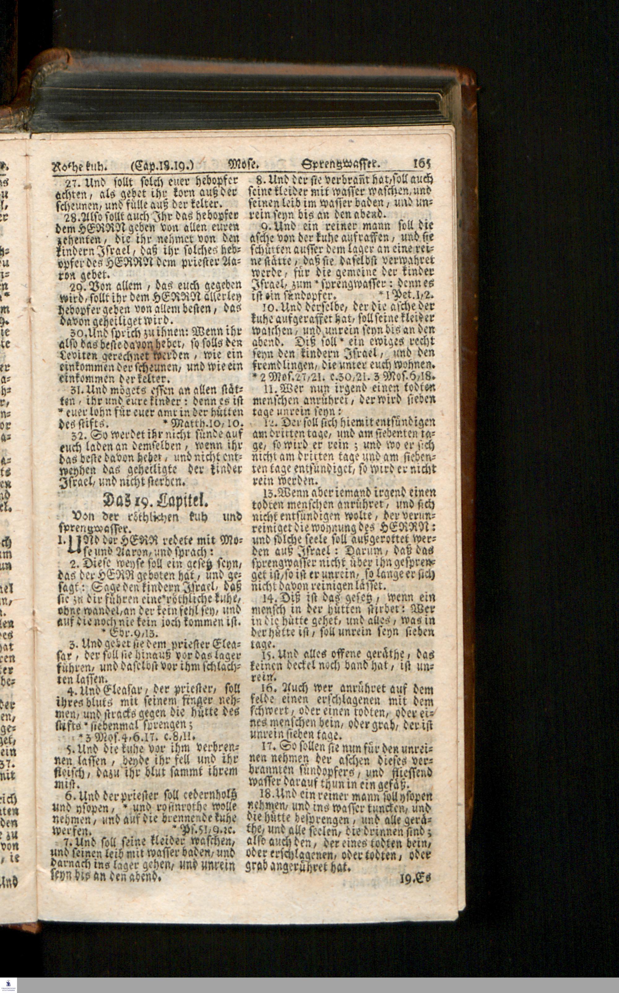 Biblia, Das ist: Die gantze Heil. Schrift Altes und Neues Testaments / Nach der Teutschen Ubersetzung D. Martin Luthers; Mit iedes Capitels kurtzen Summarien/ auch beygefügten vielen und richtigen Parallelen; Mit Fleiß übersehen, Und gegen einige/ sonderlich erstere/ Editiones des sel. Mannes gehalten, auch an unterschiedlichen Orten nach denselben eingerichtet, und von vielen in den bisherigen Exemplarien hin und wieder eingeschlichenen Druckfehlern gesaubert. Nebst einer Vorrede Hn. Baron Carl Hildebrands v. Canstein.