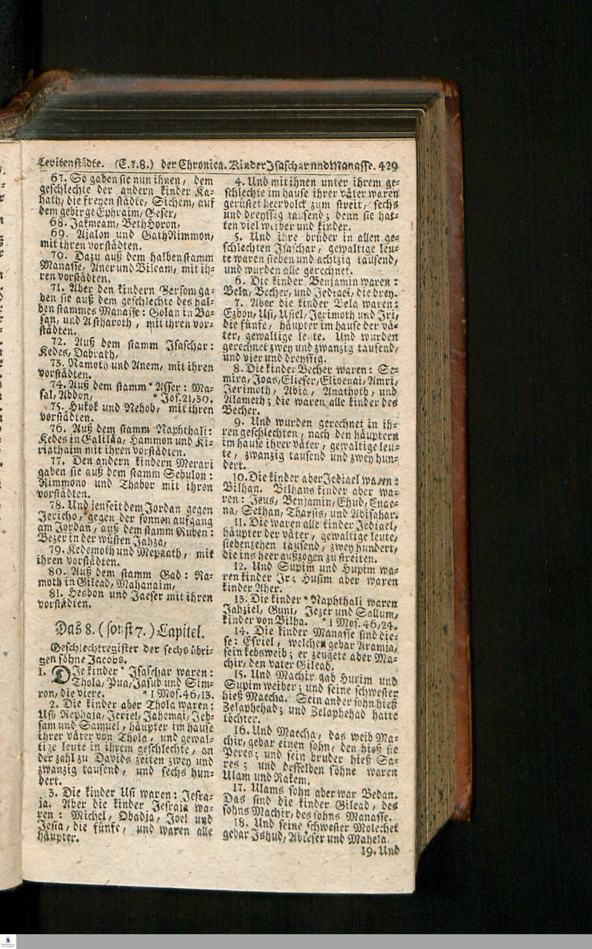 Biblia, Das ist: Die gantze Heil. Schrift Altes und Neues Testaments / Nach der Teutschen Ubersetzung D. Martin Luthers; Mit iedes Capitels kurtzen Summarien/ auch beygefügten vielen und richtigen Parallelen; Mit Fleiß übersehen, Und gegen einige/ sonderlich erstere/ Editiones des sel. Mannes gehalten, auch an unterschiedlichen Orten nach denselben eingerichtet, und von vielen in den bisherigen Exemplarien hin und wieder eingeschlichenen Druckfehlern gesaubert. Nebst einer Vorrede Hn. Baron Carl Hildebrands v. Canstein.