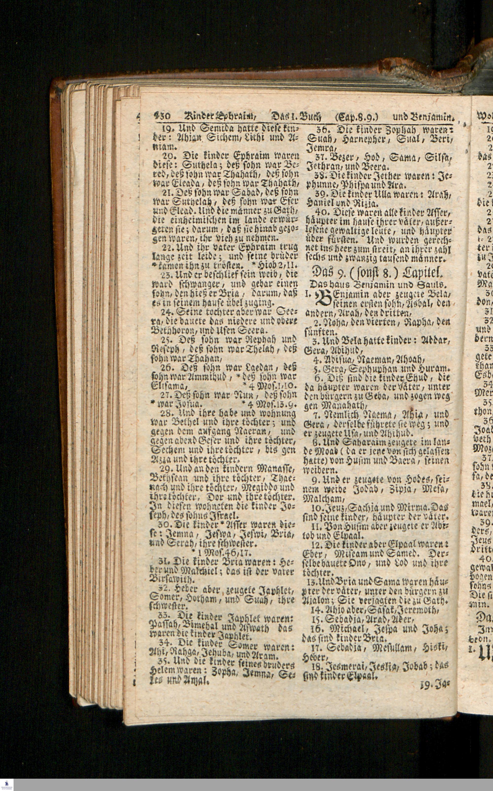 Biblia, Das ist: Die gantze Heil. Schrift Altes und Neues Testaments / Nach der Teutschen Ubersetzung D. Martin Luthers; Mit iedes Capitels kurtzen Summarien/ auch beygefügten vielen und richtigen Parallelen; Mit Fleiß übersehen, Und gegen einige/ sonderlich erstere/ Editiones des sel. Mannes gehalten, auch an unterschiedlichen Orten nach denselben eingerichtet, und von vielen in den bisherigen Exemplarien hin und wieder eingeschlichenen Druckfehlern gesaubert. Nebst einer Vorrede Hn. Baron Carl Hildebrands v. Canstein.