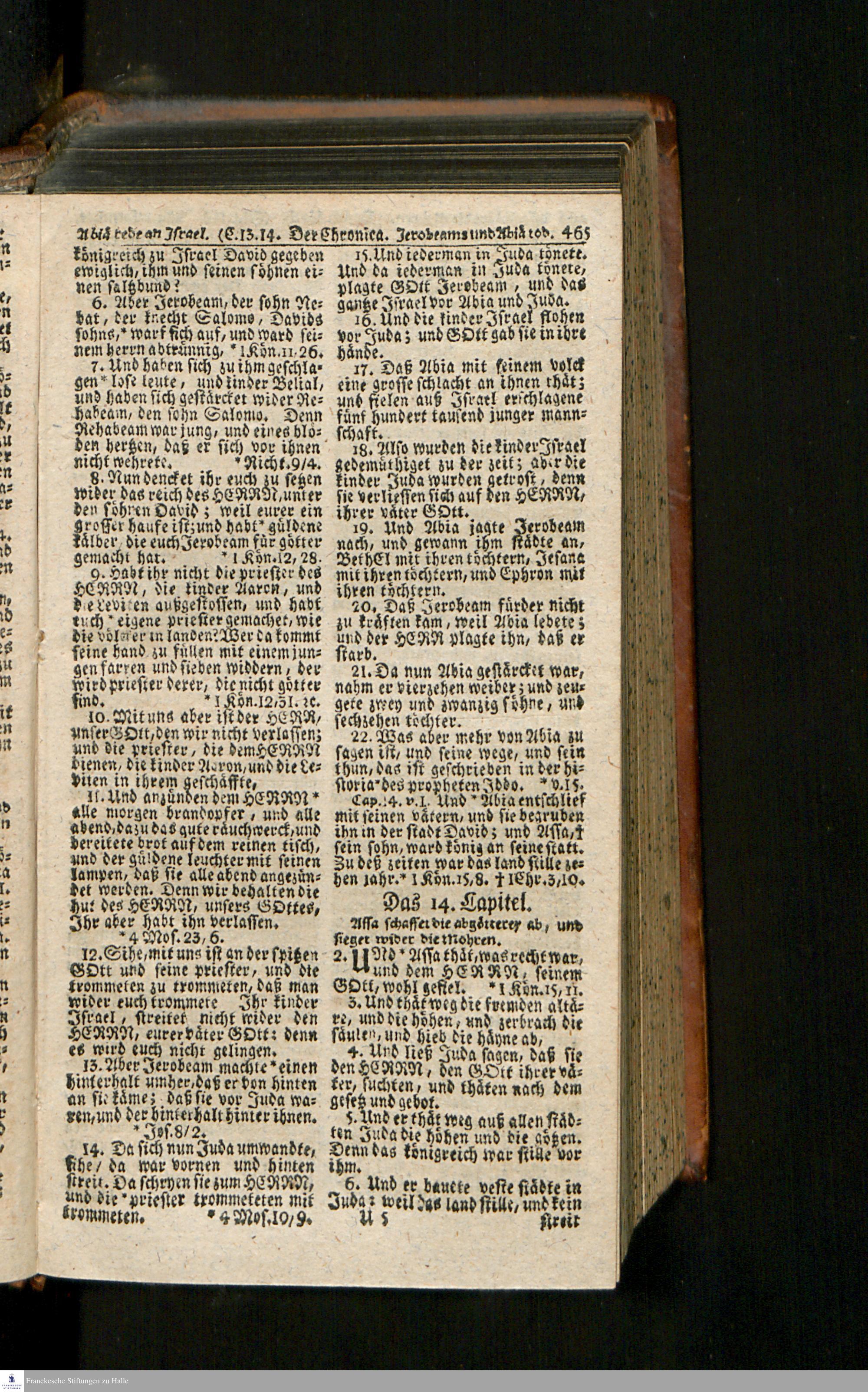Biblia, Das ist: Die gantze Heil. Schrift Altes und Neues Testaments / Nach der Teutschen Ubersetzung D. Martin Luthers; Mit iedes Capitels kurtzen Summarien/ auch beygefügten vielen und richtigen Parallelen; Mit Fleiß übersehen, Und gegen einige/ sonderlich erstere/ Editiones des sel. Mannes gehalten, auch an unterschiedlichen Orten nach denselben eingerichtet, und von vielen in den bisherigen Exemplarien hin und wieder eingeschlichenen Druckfehlern gesaubert. Nebst einer Vorrede Hn. Baron Carl Hildebrands v. Canstein.