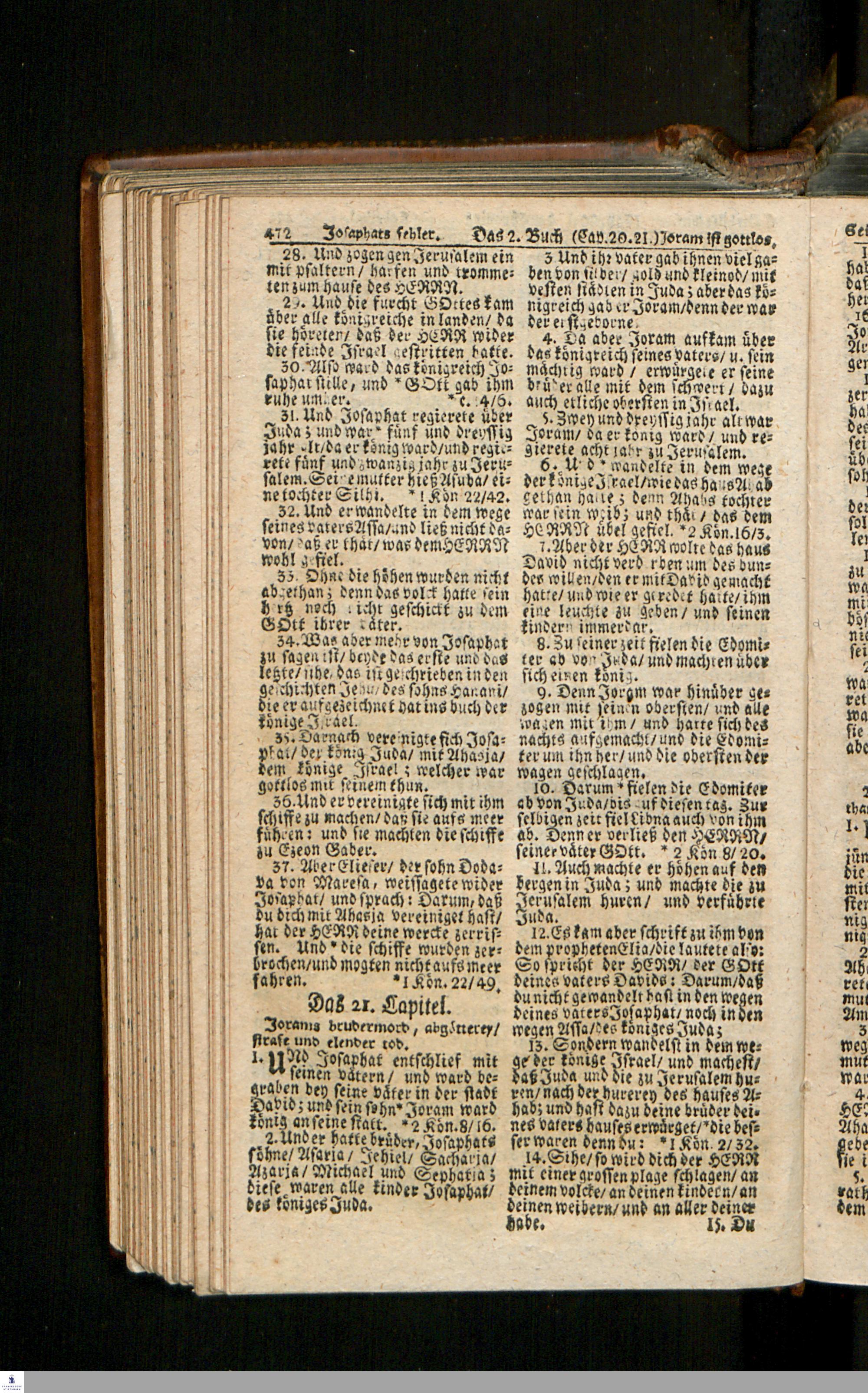 Biblia, Das ist: Die gantze Heil. Schrift Altes und Neues Testaments / Nach der Teutschen Ubersetzung D. Martin Luthers; Mit iedes Capitels kurtzen Summarien/ auch beygefügten vielen und richtigen Parallelen; Mit Fleiß übersehen, Und gegen einige/ sonderlich erstere/ Editiones des sel. Mannes gehalten, auch an unterschiedlichen Orten nach denselben eingerichtet, und von vielen in den bisherigen Exemplarien hin und wieder eingeschlichenen Druckfehlern gesaubert. Nebst einer Vorrede Hn. Baron Carl Hildebrands v. Canstein.