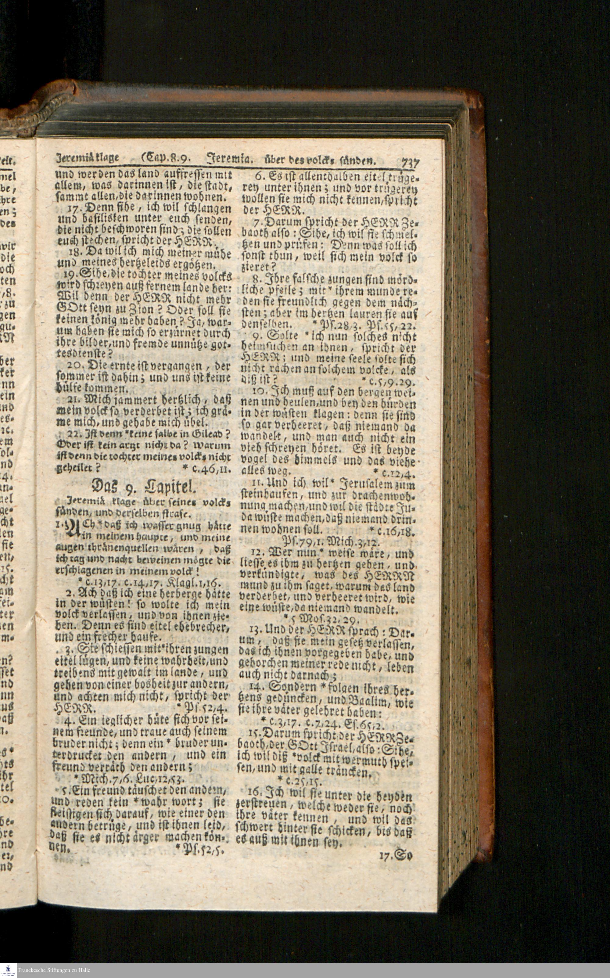 Biblia, Das ist: Die gantze Heil. Schrift Altes und Neues Testaments / Nach der Teutschen Ubersetzung D. Martin Luthers; Mit iedes Capitels kurtzen Summarien/ auch beygefügten vielen und richtigen Parallelen; Mit Fleiß übersehen, Und gegen einige/ sonderlich erstere/ Editiones des sel. Mannes gehalten, auch an unterschiedlichen Orten nach denselben eingerichtet, und von vielen in den bisherigen Exemplarien hin und wieder eingeschlichenen Druckfehlern gesaubert. Nebst einer Vorrede Hn. Baron Carl Hildebrands v. Canstein.