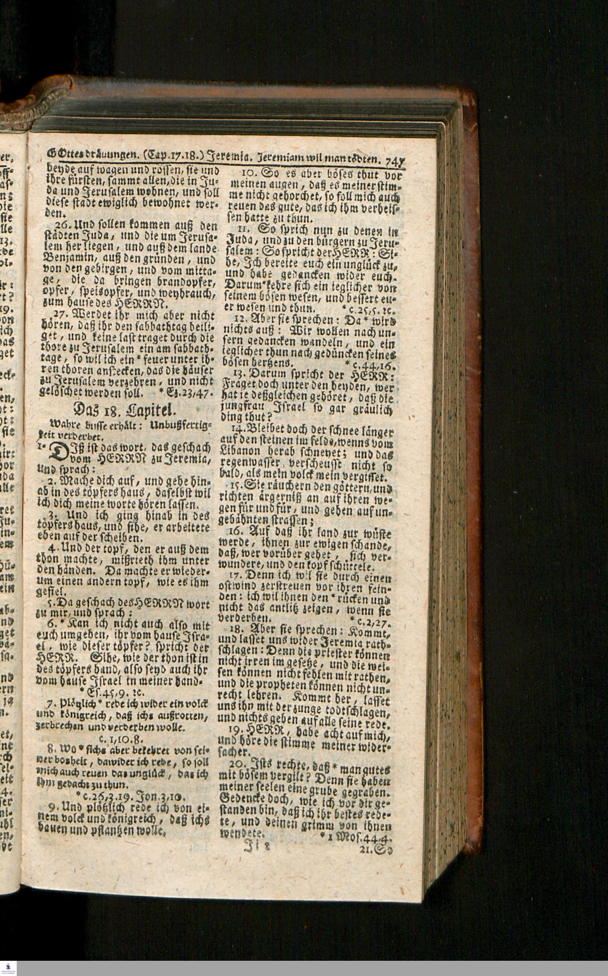Biblia, Das ist: Die gantze Heil. Schrift Altes und Neues Testaments / Nach der Teutschen Ubersetzung D. Martin Luthers; Mit iedes Capitels kurtzen Summarien/ auch beygefügten vielen und richtigen Parallelen; Mit Fleiß übersehen, Und gegen einige/ sonderlich erstere/ Editiones des sel. Mannes gehalten, auch an unterschiedlichen Orten nach denselben eingerichtet, und von vielen in den bisherigen Exemplarien hin und wieder eingeschlichenen Druckfehlern gesaubert. Nebst einer Vorrede Hn. Baron Carl Hildebrands v. Canstein.