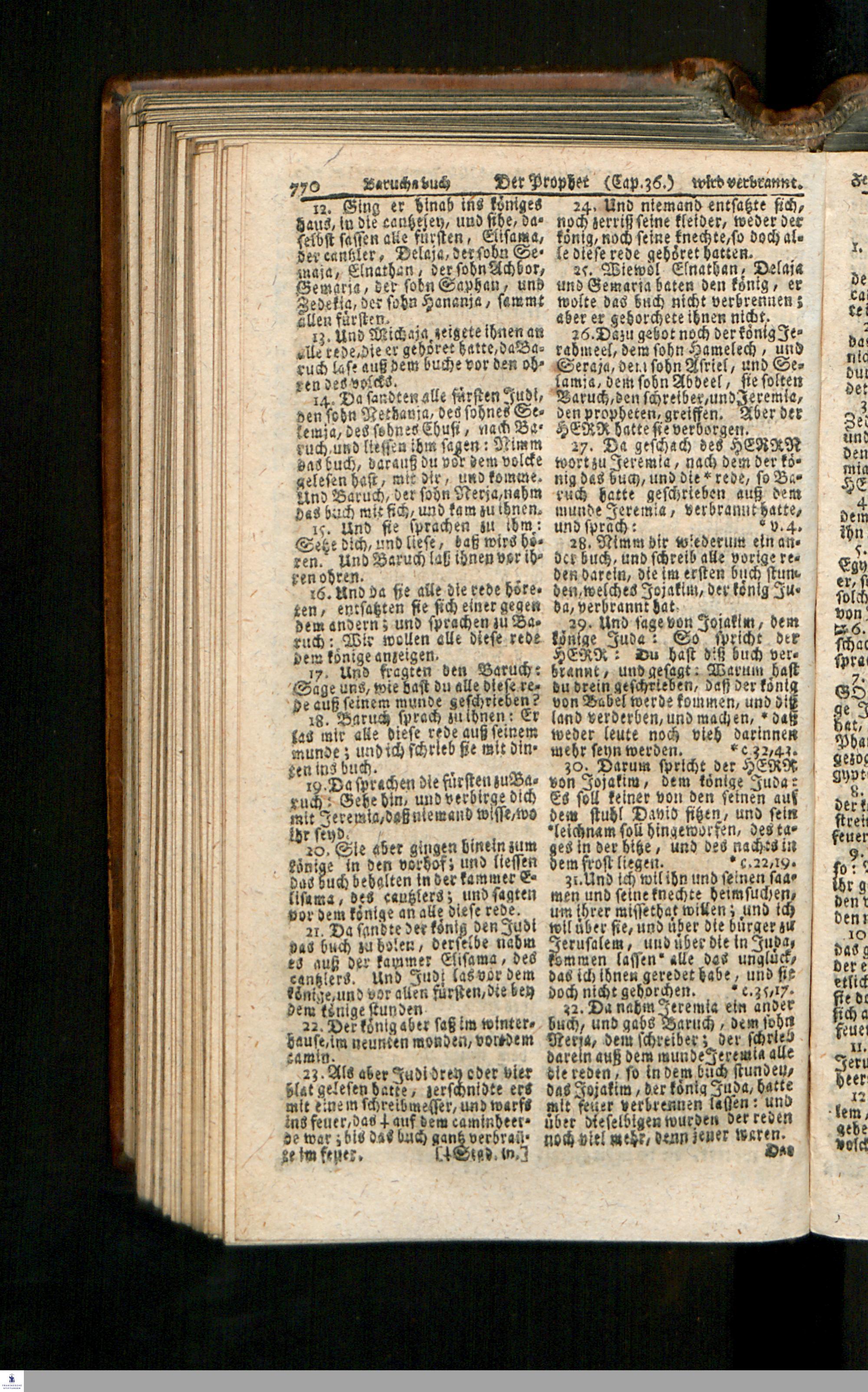 Biblia, Das ist: Die gantze Heil. Schrift Altes und Neues Testaments / Nach der Teutschen Ubersetzung D. Martin Luthers; Mit iedes Capitels kurtzen Summarien/ auch beygefügten vielen und richtigen Parallelen; Mit Fleiß übersehen, Und gegen einige/ sonderlich erstere/ Editiones des sel. Mannes gehalten, auch an unterschiedlichen Orten nach denselben eingerichtet, und von vielen in den bisherigen Exemplarien hin und wieder eingeschlichenen Druckfehlern gesaubert. Nebst einer Vorrede Hn. Baron Carl Hildebrands v. Canstein.