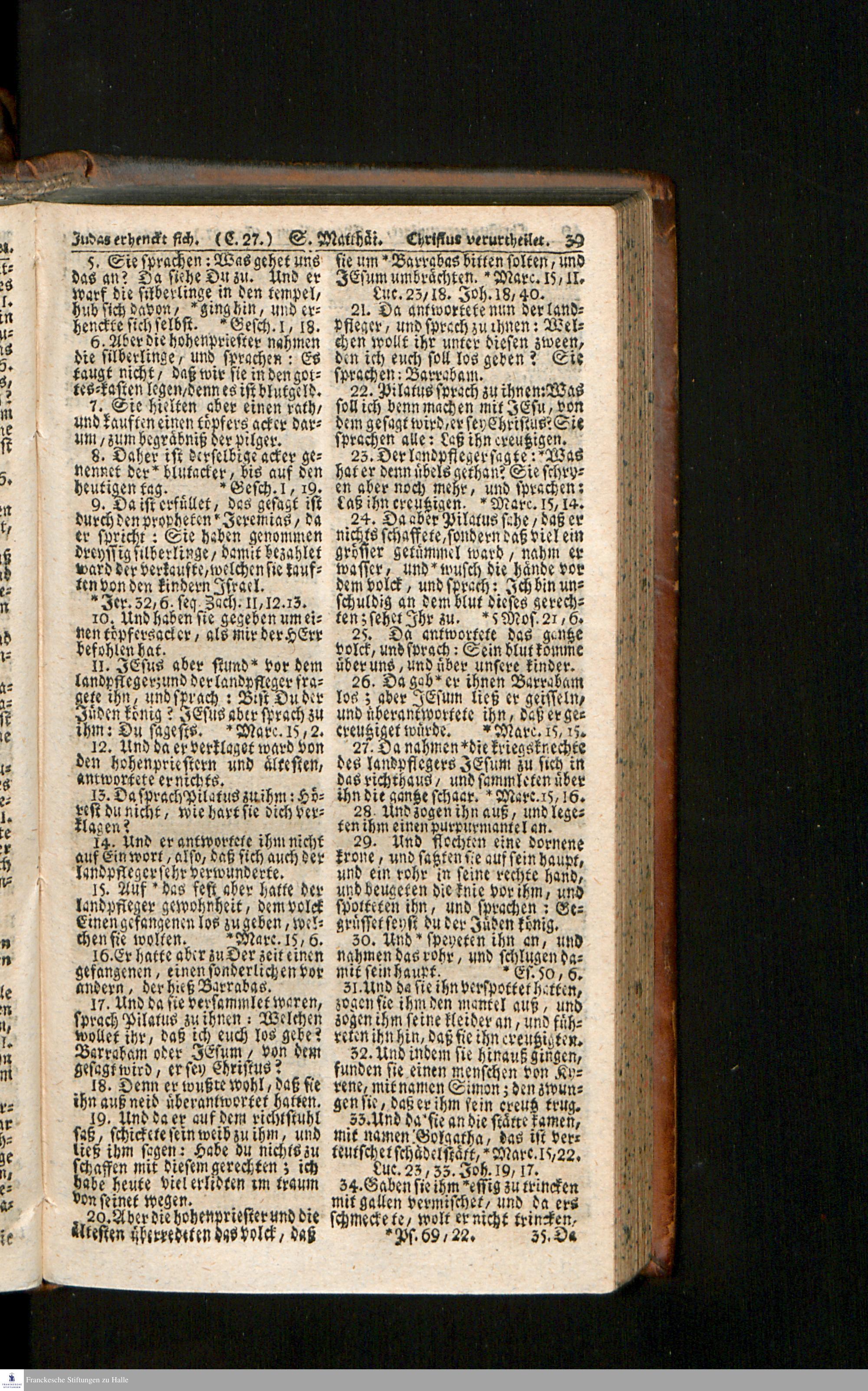 Biblia, Das ist: Die gantze Heil. Schrift Altes und Neues Testaments / Nach der Teutschen Ubersetzung D. Martin Luthers; Mit iedes Capitels kurtzen Summarien/ auch beygefügten vielen und richtigen Parallelen; Mit Fleiß übersehen, Und gegen einige/ sonderlich erstere/ Editiones des sel. Mannes gehalten, auch an unterschiedlichen Orten nach denselben eingerichtet, und von vielen in den bisherigen Exemplarien hin und wieder eingeschlichenen Druckfehlern gesaubert. Nebst einer Vorrede Hn. Baron Carl Hildebrands v. Canstein.