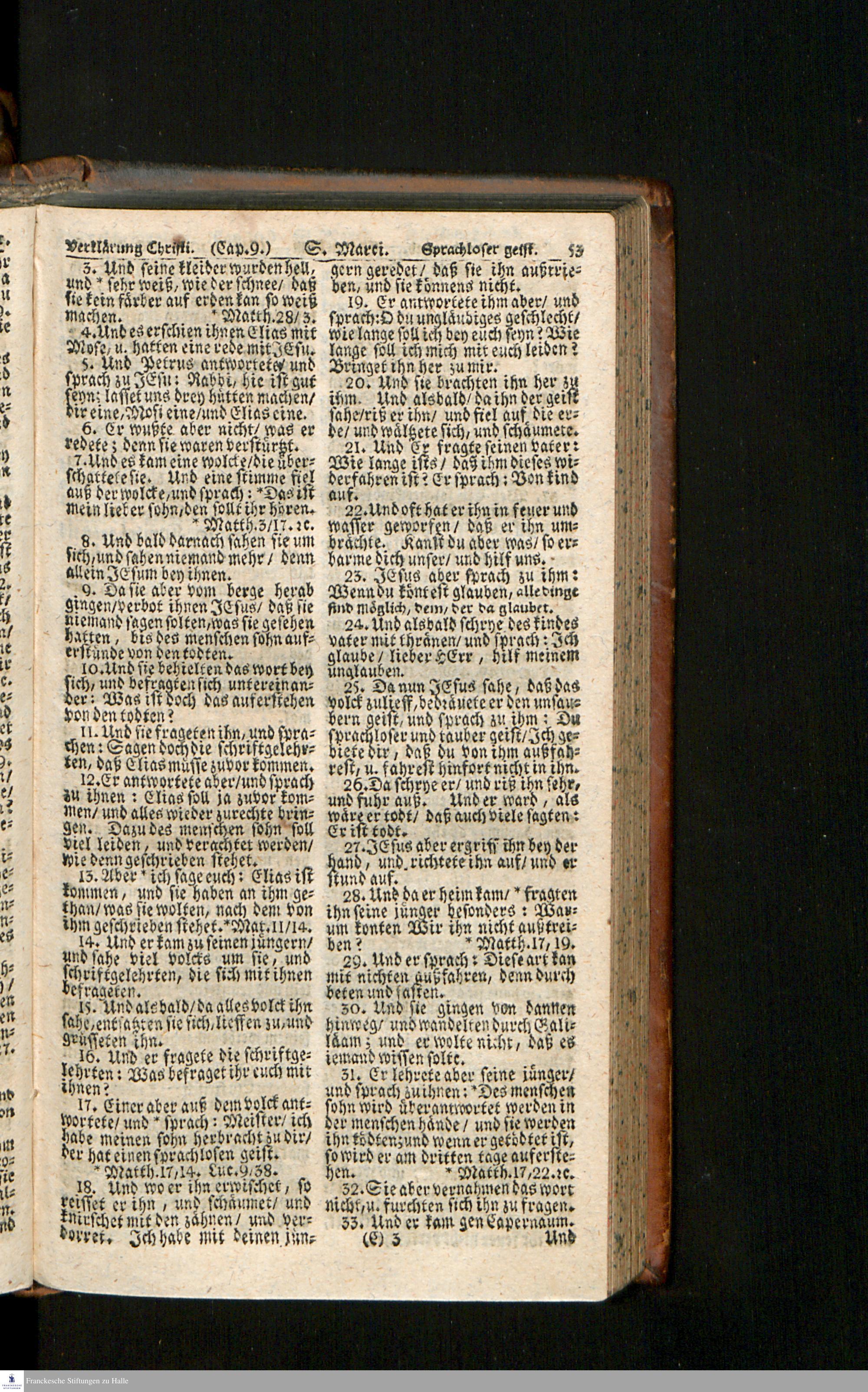 Biblia, Das ist: Die gantze Heil. Schrift Altes und Neues Testaments / Nach der Teutschen Ubersetzung D. Martin Luthers; Mit iedes Capitels kurtzen Summarien/ auch beygefügten vielen und richtigen Parallelen; Mit Fleiß übersehen, Und gegen einige/ sonderlich erstere/ Editiones des sel. Mannes gehalten, auch an unterschiedlichen Orten nach denselben eingerichtet, und von vielen in den bisherigen Exemplarien hin und wieder eingeschlichenen Druckfehlern gesaubert. Nebst einer Vorrede Hn. Baron Carl Hildebrands v. Canstein.