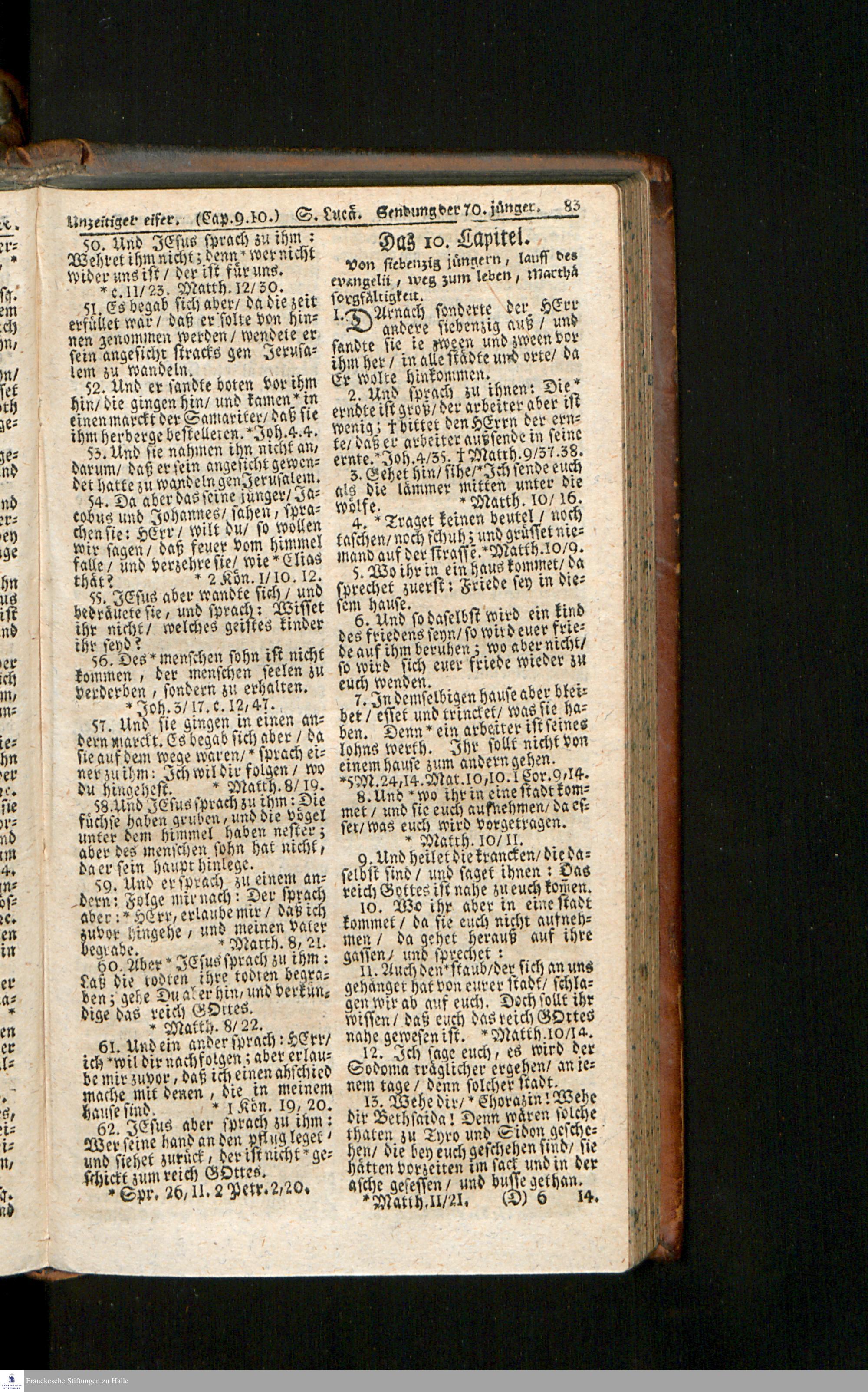 Biblia, Das ist: Die gantze Heil. Schrift Altes und Neues Testaments / Nach der Teutschen Ubersetzung D. Martin Luthers; Mit iedes Capitels kurtzen Summarien/ auch beygefügten vielen und richtigen Parallelen; Mit Fleiß übersehen, Und gegen einige/ sonderlich erstere/ Editiones des sel. Mannes gehalten, auch an unterschiedlichen Orten nach denselben eingerichtet, und von vielen in den bisherigen Exemplarien hin und wieder eingeschlichenen Druckfehlern gesaubert. Nebst einer Vorrede Hn. Baron Carl Hildebrands v. Canstein.
