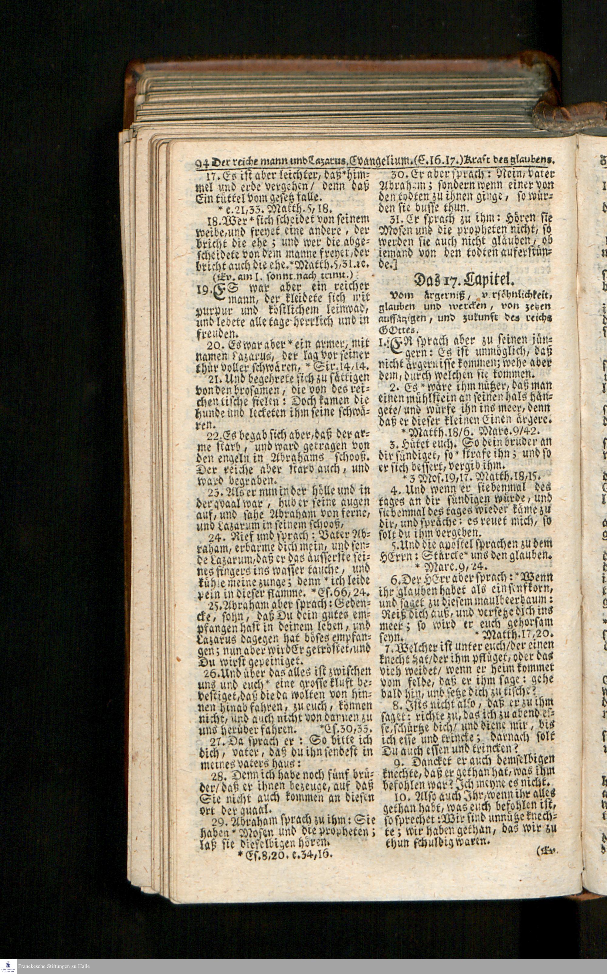 Biblia, Das ist: Die gantze Heil. Schrift Altes und Neues Testaments / Nach der Teutschen Ubersetzung D. Martin Luthers; Mit iedes Capitels kurtzen Summarien/ auch beygefügten vielen und richtigen Parallelen; Mit Fleiß übersehen, Und gegen einige/ sonderlich erstere/ Editiones des sel. Mannes gehalten, auch an unterschiedlichen Orten nach denselben eingerichtet, und von vielen in den bisherigen Exemplarien hin und wieder eingeschlichenen Druckfehlern gesaubert. Nebst einer Vorrede Hn. Baron Carl Hildebrands v. Canstein.