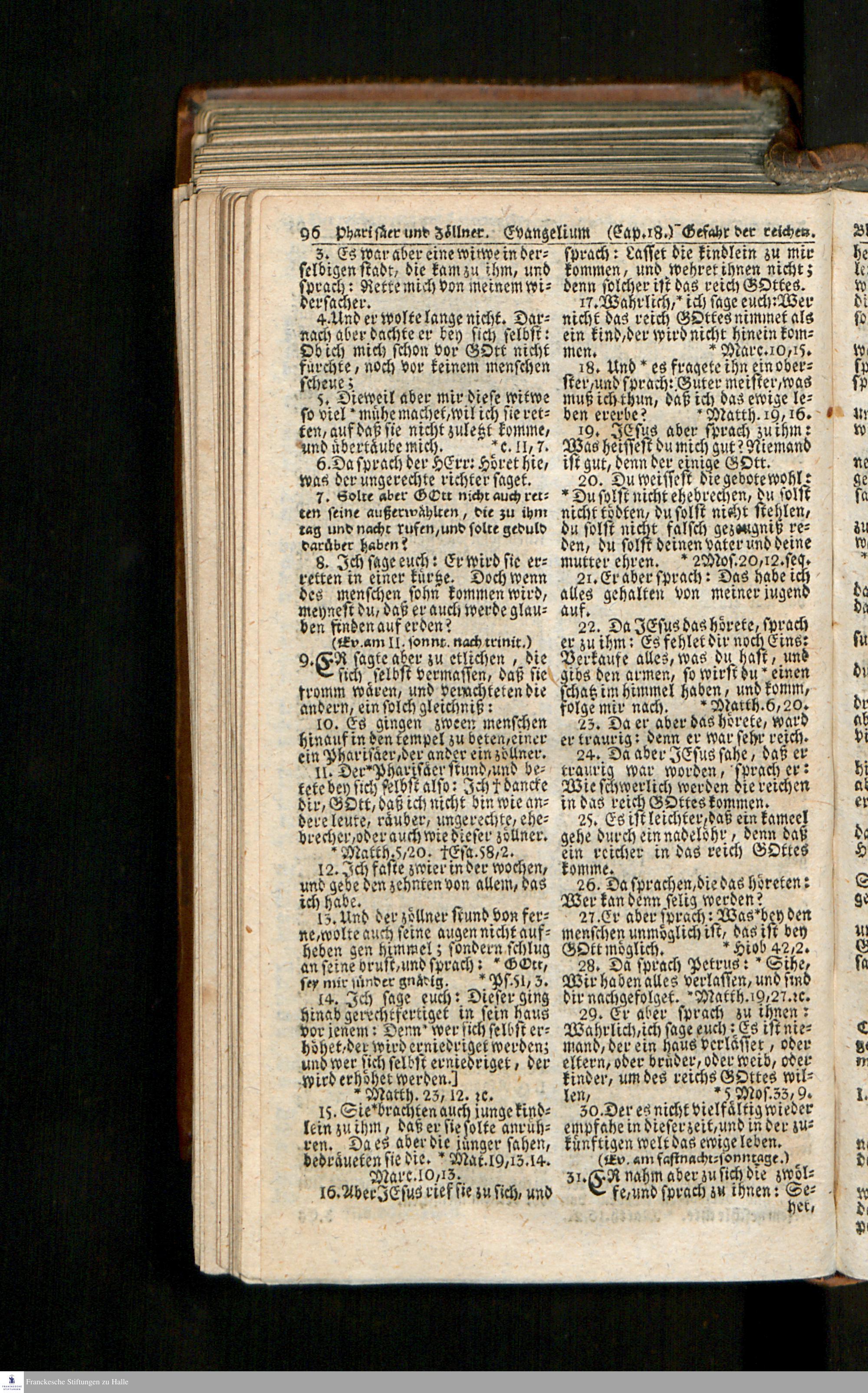 Biblia, Das ist: Die gantze Heil. Schrift Altes und Neues Testaments / Nach der Teutschen Ubersetzung D. Martin Luthers; Mit iedes Capitels kurtzen Summarien/ auch beygefügten vielen und richtigen Parallelen; Mit Fleiß übersehen, Und gegen einige/ sonderlich erstere/ Editiones des sel. Mannes gehalten, auch an unterschiedlichen Orten nach denselben eingerichtet, und von vielen in den bisherigen Exemplarien hin und wieder eingeschlichenen Druckfehlern gesaubert. Nebst einer Vorrede Hn. Baron Carl Hildebrands v. Canstein.