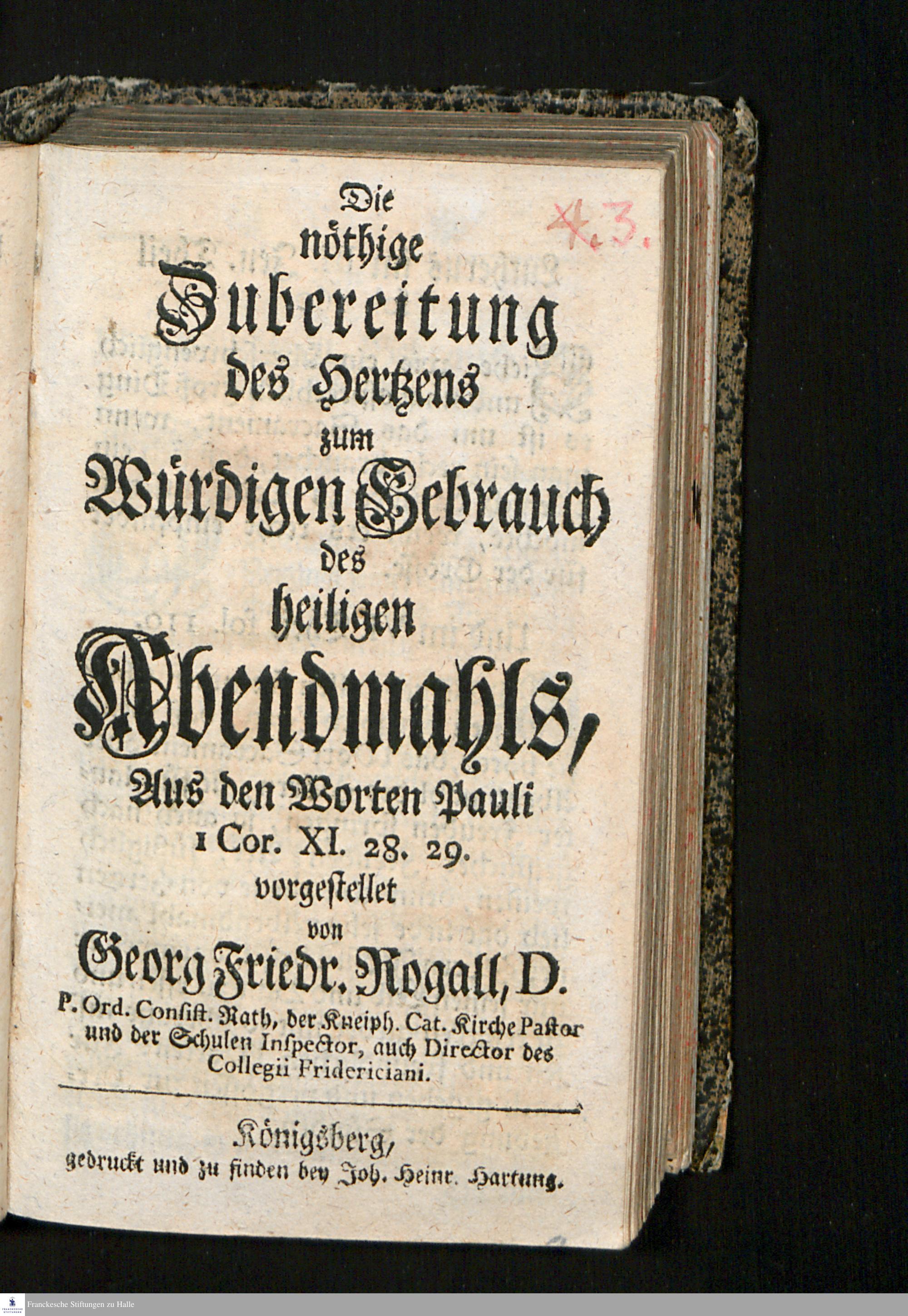 Die nöthige Zubereitung des Hertzens zum Würdigen Gebrauch des heiligen Abendmahls : Aus den Worten Pauli I Cor. XI. 28. 29. vorgestellet / von Georg Friedr. Rogall, D. P. Ord. Consist. Rath, der Kneiph. Cat. Kirche Pastor und der Schulen Inspector, auch Director des Collegii Fridericiani.