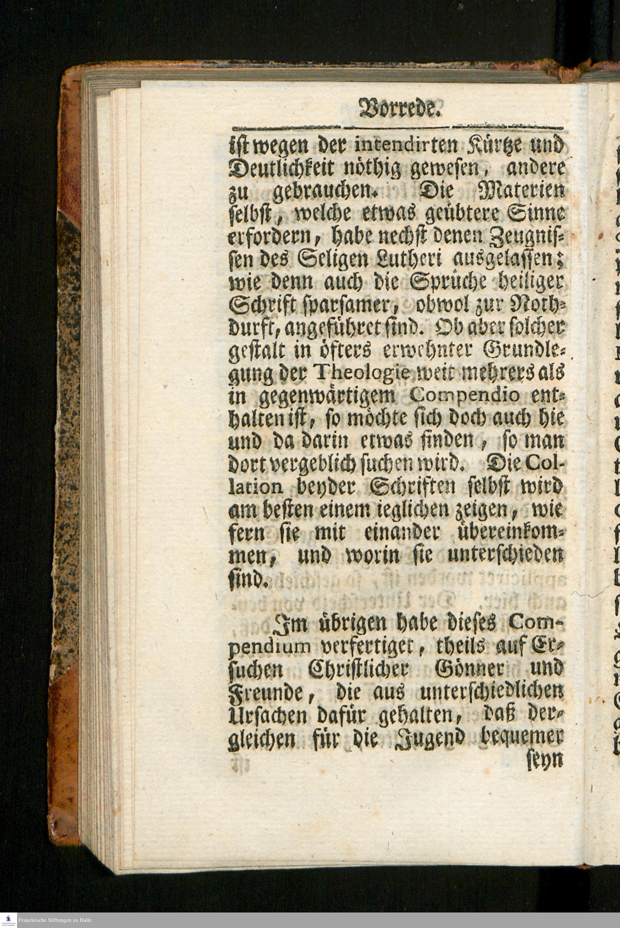 Compendium, oder Kurtzer Begriff der gantzen Christlichen Lehre in XXXIV. Articuln/ : nebst einer Summarischen Vorstellung der Göttlichen Ordnung des Heyls in Fragen und Antwort einfältig und Schriftmäßig entworfen / von Ioh. Anastasio Freylinghausen/ Past. zu St. Ulrich und des Gymnasii Scholarcha.