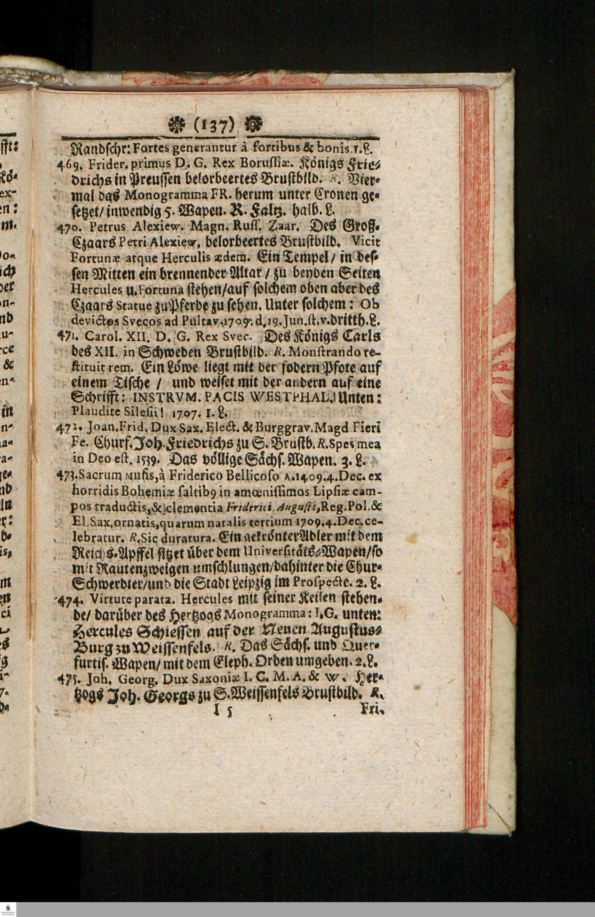 Catalogus nicht alleine Sehr curiöser alten Hebræischen/ Griechischen/ Römischen und Teutschen Müntzen von Gold/ Silber und Kupffer; sondern auch Modernen Medailles von Gold und Silber/ ingleichen Raren Thalern/ auf Kayser/ Päpste/ Könige/ Chur- und Fürsten/ Grafen/ Städte/ auch sonst allerhand Begebenheiten geschlagen : Welche alle unter öffentlicher Auction den 14. Jan. des mit G. bald eintretenden 1715. Jahres in Gotha/ auf dem Kauff-Hause/ vormittags von 9. bis 12. Uhr/ und nachmittags von 2. bis 6. Uhr an die Meist-biethenden sollen verkauffet werden / [Christian Schlegel]