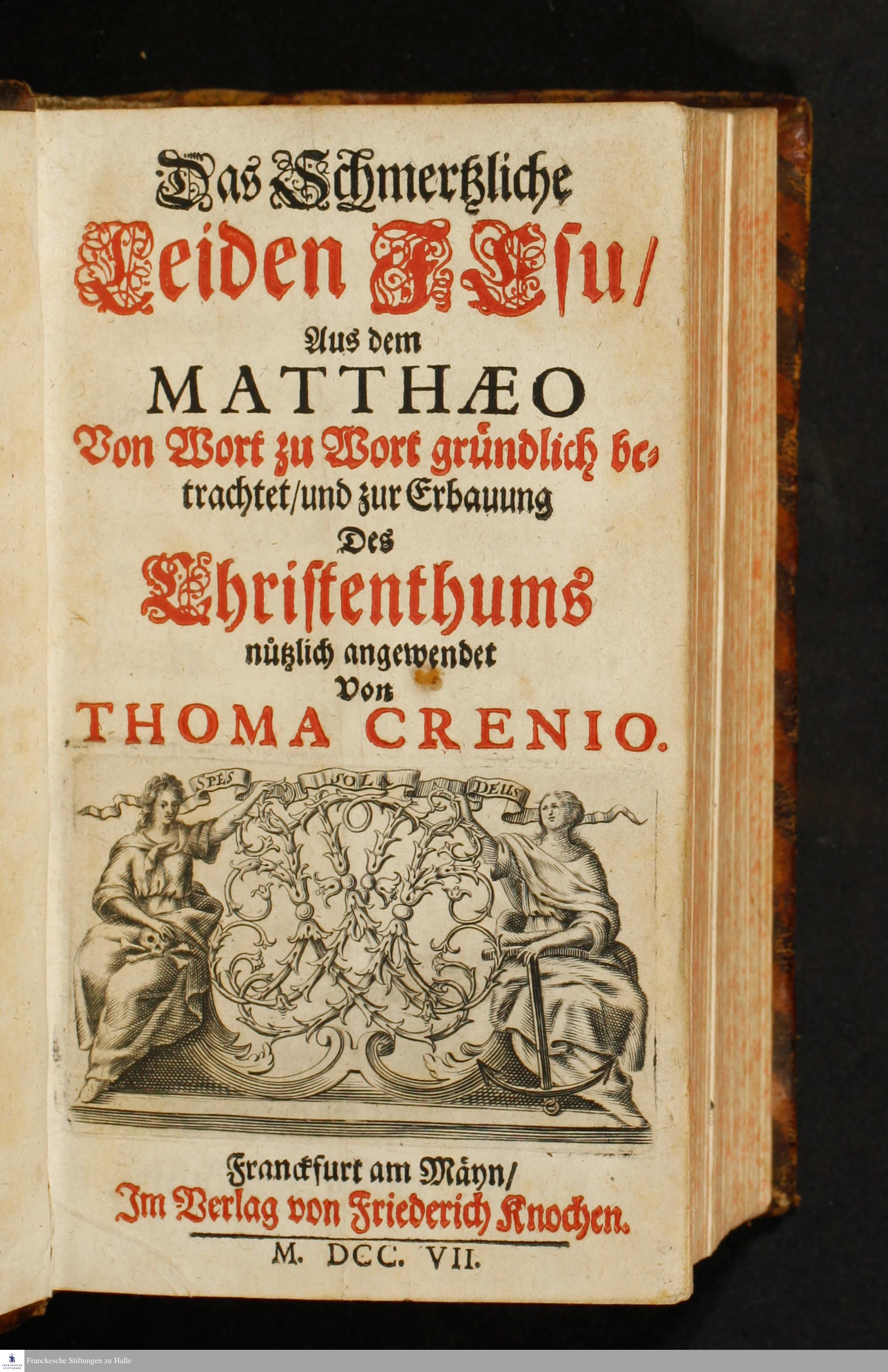 Das Schmertzliche Leiden Jesu : Aus dem Matthæo Von Wort zu Wort gründlich betrachtet/ und zur Erbauung Des Christenthums nützlich angewendet / Von Thoma Crenio [i.e. Thomas Theodor Crusius]
