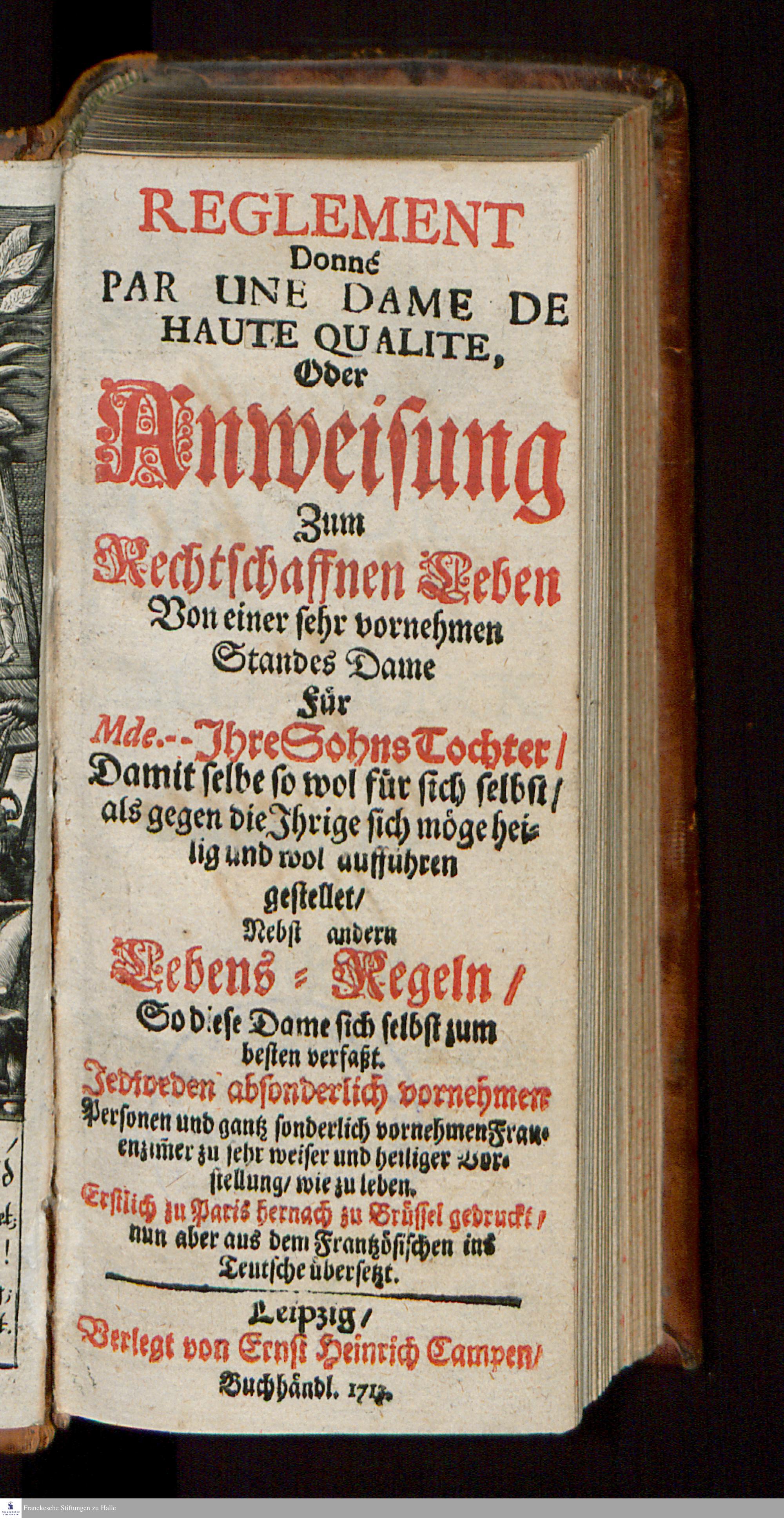 Réglément Donné Par Une Dame De Haute Qualité, Oder Anweisung Zum Rechtschaffnen Leben Von einer sehr vornehmen Standes Dame Für Mde. ... Ihre Sohns Tochter/ Damit selbe so wol für sich selbst/ als gegen die Ihrige sich möge heilig und wol aufführen gestellet / Nebst andern Lebens-Regeln/ So diese Dame sich selbst zum besten verfaßt$h[von Jeanne de Schomberg duchesse de Liancourt]. Erstlich zu Paris hernach zu Brüssel gedruckt, nun aber aus dem Frantzösischen ins Teutsche übersetzt.