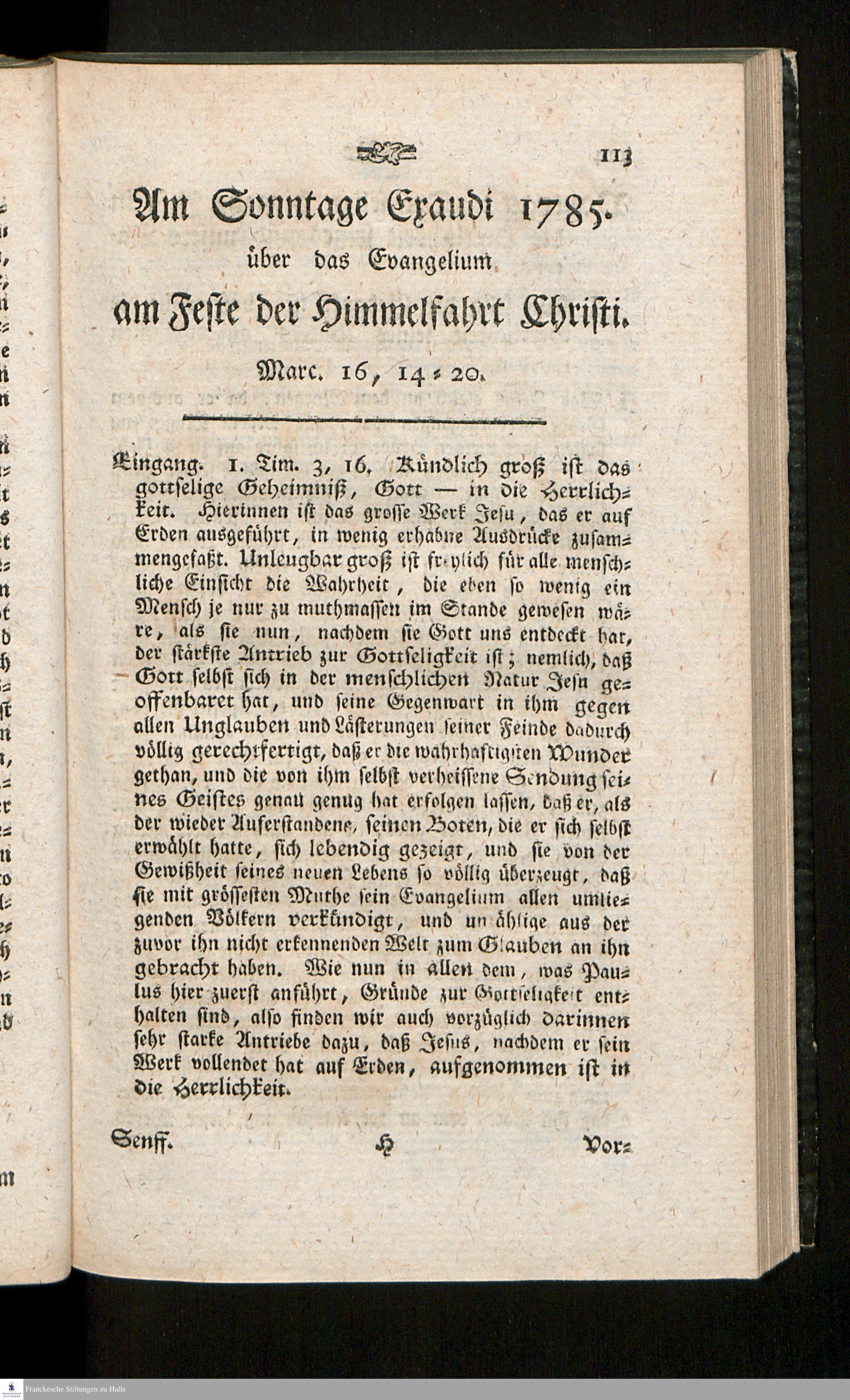 Abrisse der Vormittags-Predigten an den Sonn- und Festtagen im Kirchenjahre 1785 : gehalten in der St. Moritzkirche in Halle / von Carl Friedrich Senff, ... Stadt-Ministerii Inspektor, Pastors zu St. Moritz, und des evang. luth. Gym. Scholarchen.