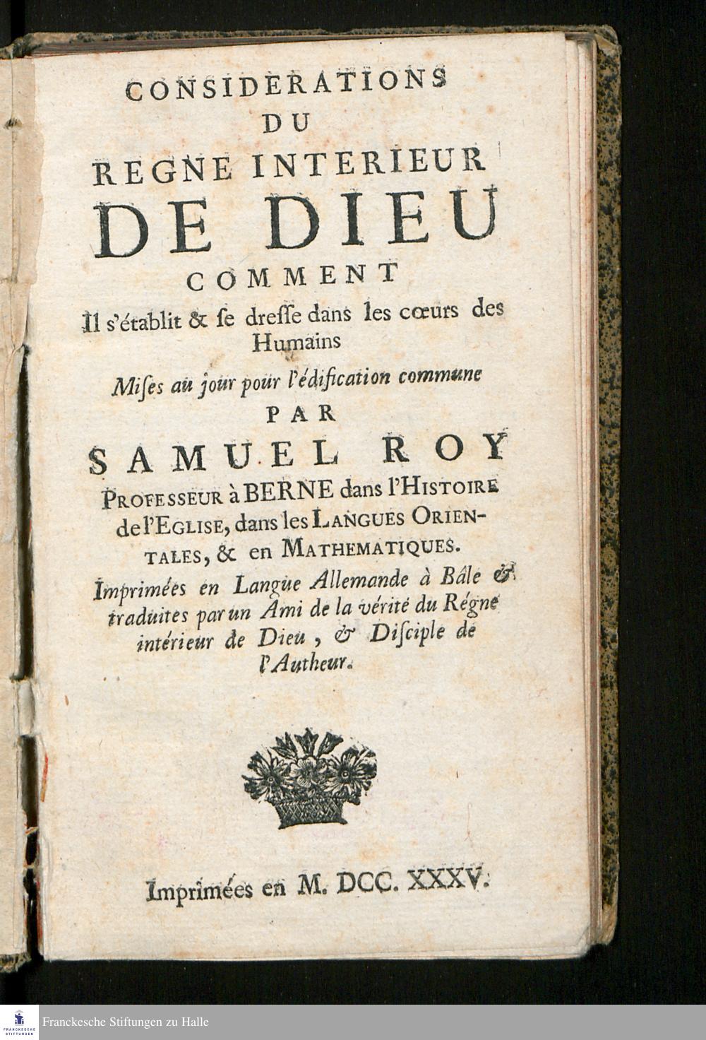 Considerations Du Regne Interieur De Dieu Comment Il s'établit & se dresse dans les cœurs des Humains / Mises au jour pour l'édification commune Par Samuel Roy Professeur à Berne dans l'Histoire de l'Eglise ... Imprimées en Langue Allemande à Bâle & traduites par un Ami de la vérité du Régne intérieur de Dieu, & Disciple de l'Autheur. [Joseph d'Eymond]