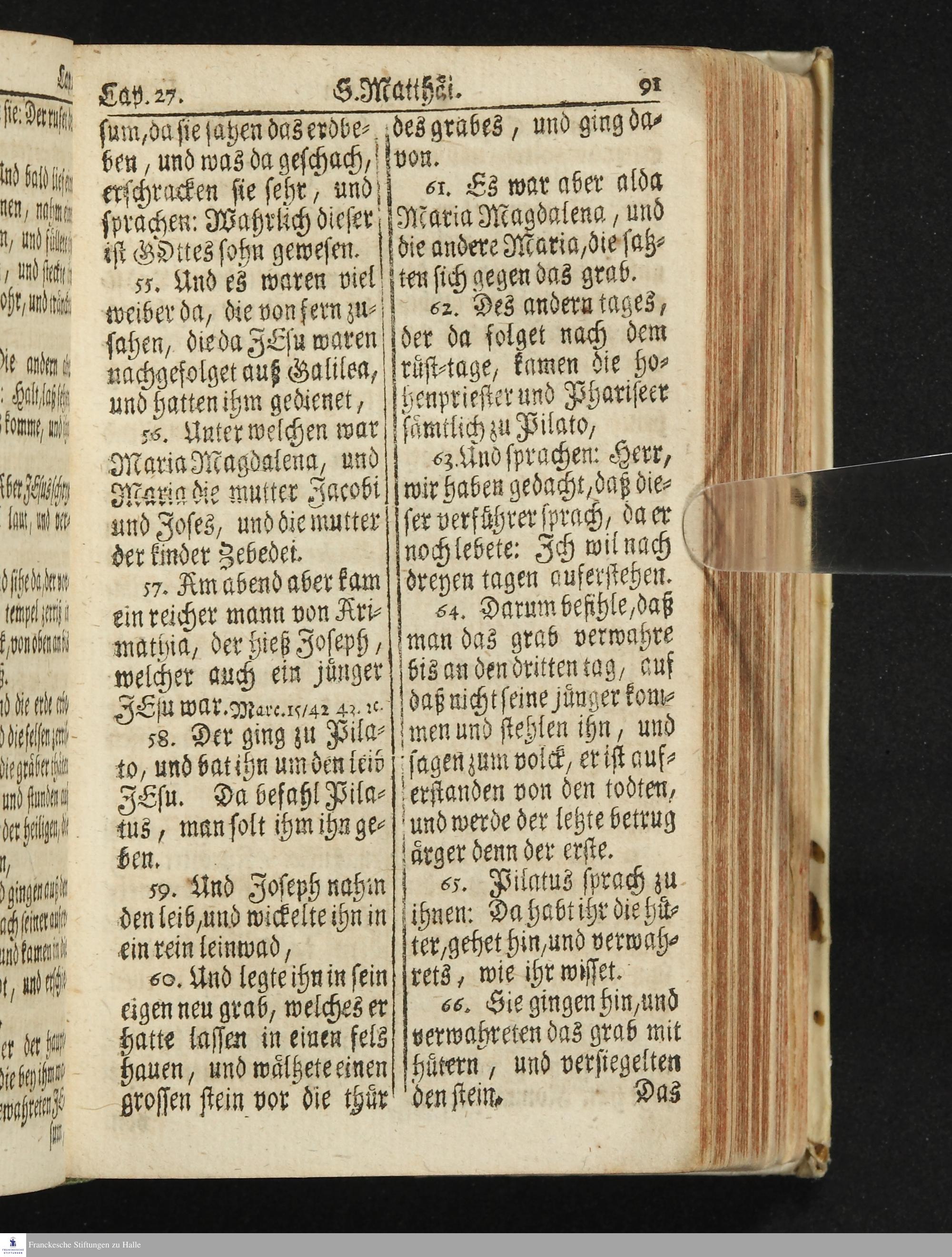 Das Neue Testament Unsers HErrn und Heylandes JEsu Christi / Verteutscht Von D. Martin Luthern, Mit Jedes Capituls kurtzen Summarien Und nöthigsten locis parallelis. Nebst einer Vorrede Hrn. Baron Carl Hildebrand von Canstein.