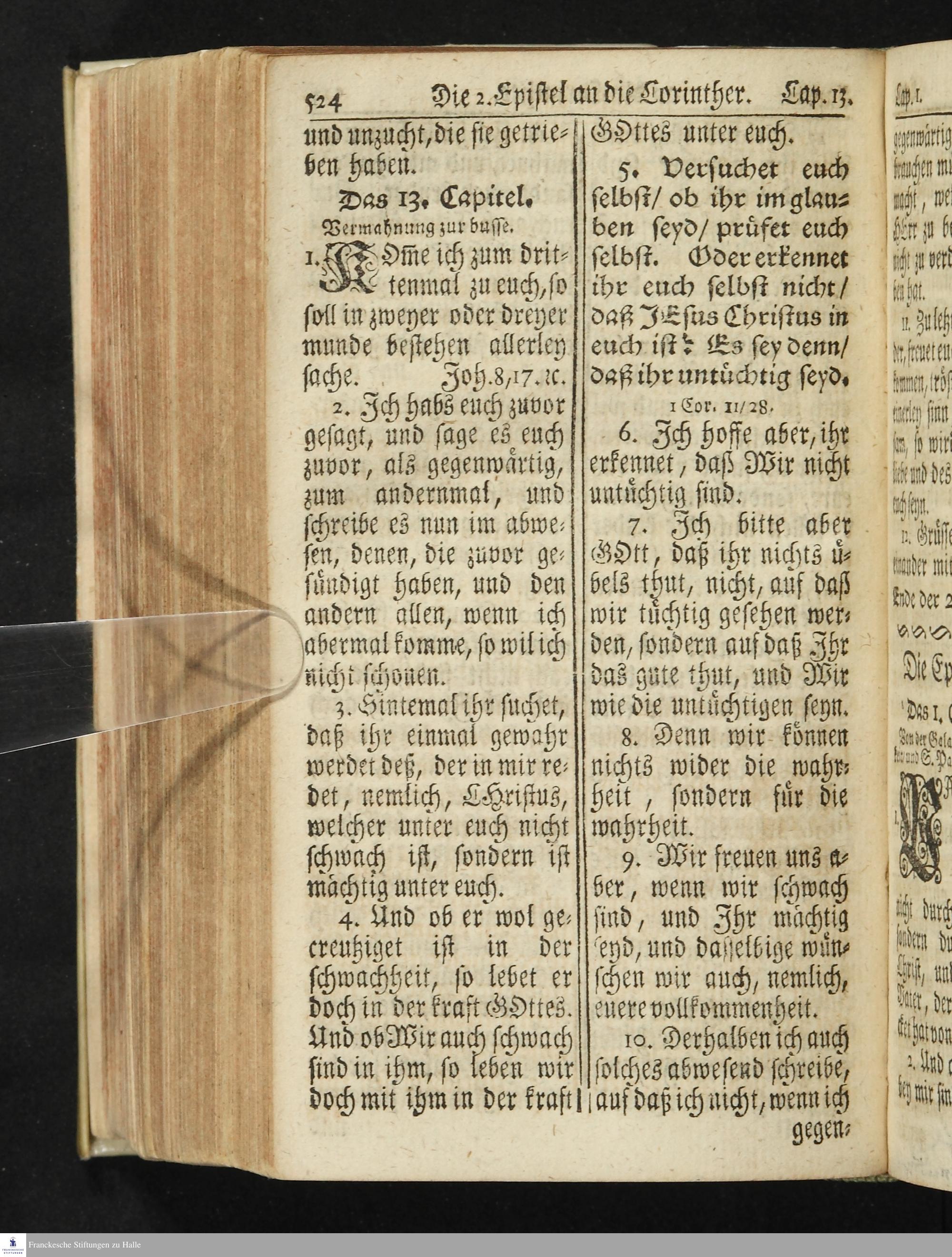 Das Neue Testament Unsers HErrn und Heylandes JEsu Christi / Verteutscht Von D. Martin Luthern, Mit Jedes Capituls kurtzen Summarien Und nöthigsten locis parallelis. Nebst einer Vorrede Hrn. Baron Carl Hildebrand von Canstein.