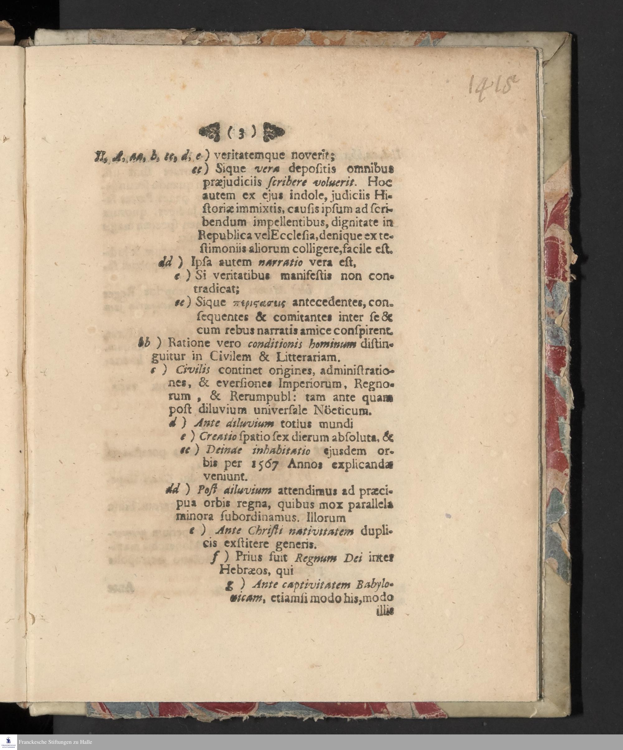 [Specimen Primum Historiae Analyticae, exhibens Res In Republica Hebraeorum A Condito Mundo usque ad Christum natum gestae]