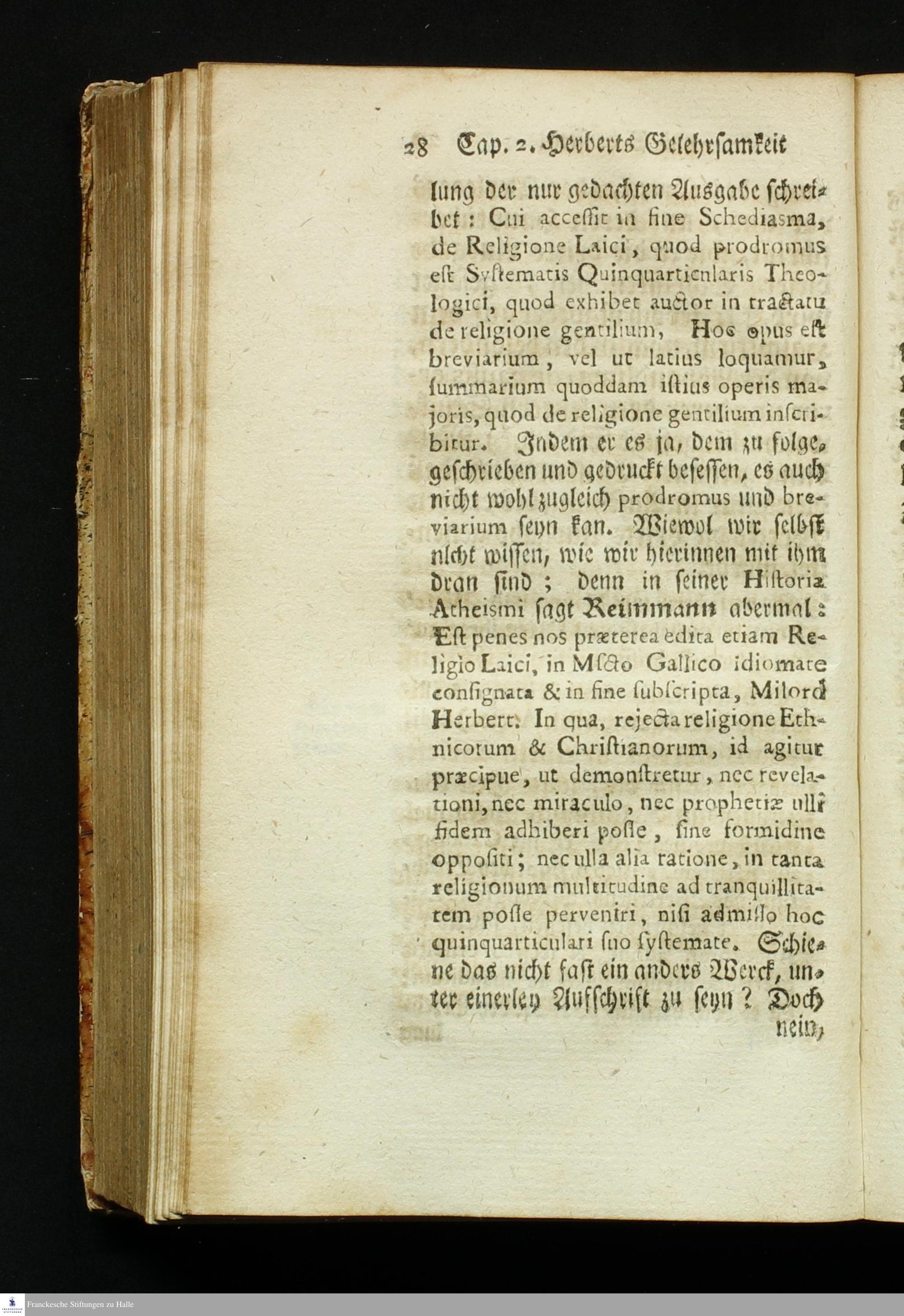 Worinne besonders Von dem Leben, Schrifften, Nachfolgern und Gegnern des berühmten und gelehrten Englischen Lords Edoard Herbert de Cherbury [et]c. als deren Vorgängers und Anführers, gehandelt wird, Aus seinen eignen Schrifften und vielen besondern Nachrichten zusammen getragen und mit nöthigen Anmerckungen erläutert / von Christoph Gottlob Grundig, A.M.V.D.M.