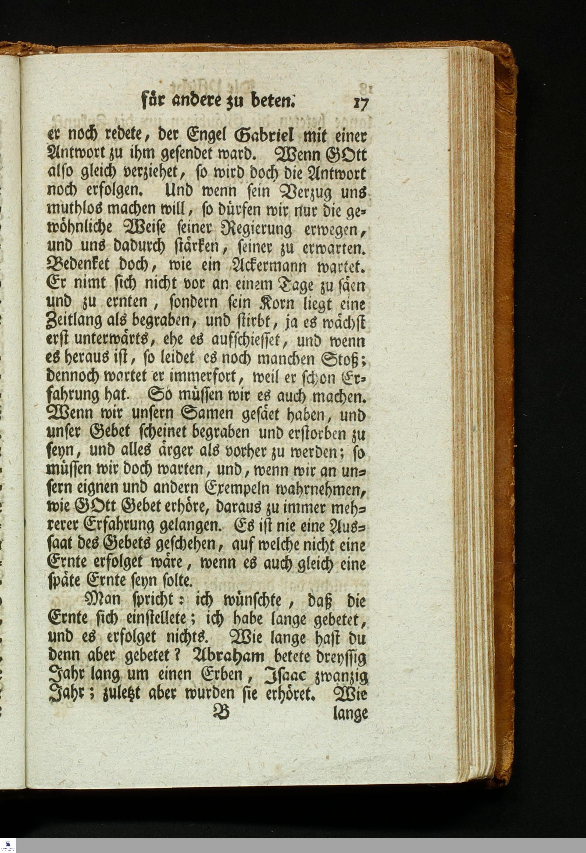 Die Pflicht für andere zu beten, welche durch einige Gründe aus dem gesegneten Erfolg des Gebets der Kirche um des Apostels Petri Befreyung aus dem Gefängniß eingeschärfet wird / London gedruckt im Jahr 1757. aus dem Englischen ins Teutsche übersetzt.