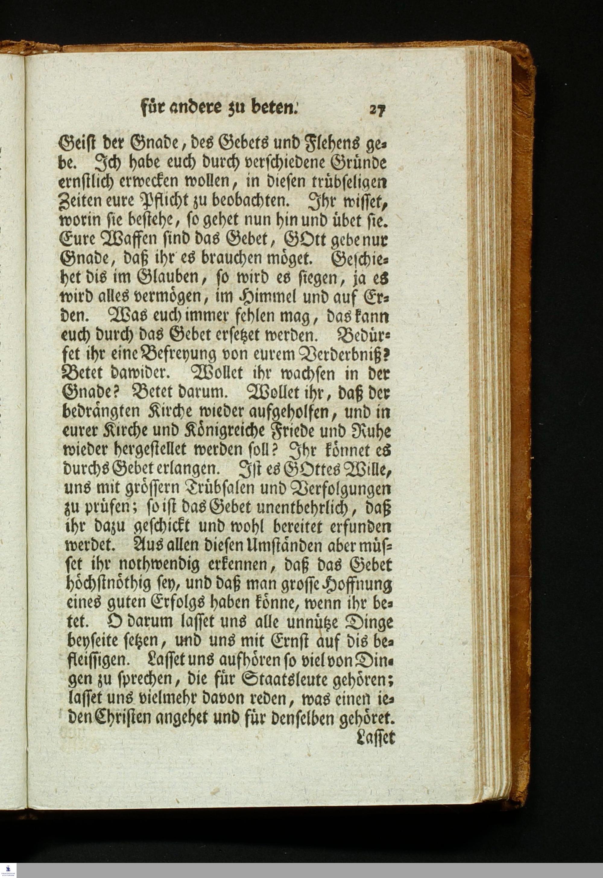 Die Pflicht für andere zu beten, welche durch einige Gründe aus dem gesegneten Erfolg des Gebets der Kirche um des Apostels Petri Befreyung aus dem Gefängniß eingeschärfet wird / London gedruckt im Jahr 1757. aus dem Englischen ins Teutsche übersetzt.
