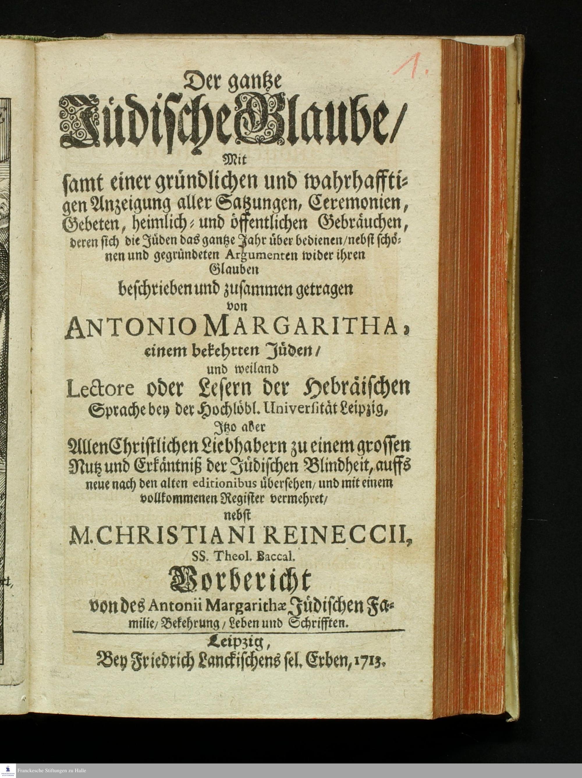 Der gantze Jüdische Glaube : Mit samt einer gründlichen und wahrhafftigen Anzeigung aller Satzungen, Ceremonien, Gebeten, heimlich- und öffentlichen Gebräuchen, deren sich die Jüden das gantze Jahr über bedienen : nebst schönen und gegründeten Argumenten wider ihren Glauben / beschrieben und zusammen getragen von Antonio Margaritha, einem bekehrten Jüden/ und weiland Lectore oder Lesern der Hebräischen Sprache bey der Hochlöbl. Universität Leipzig