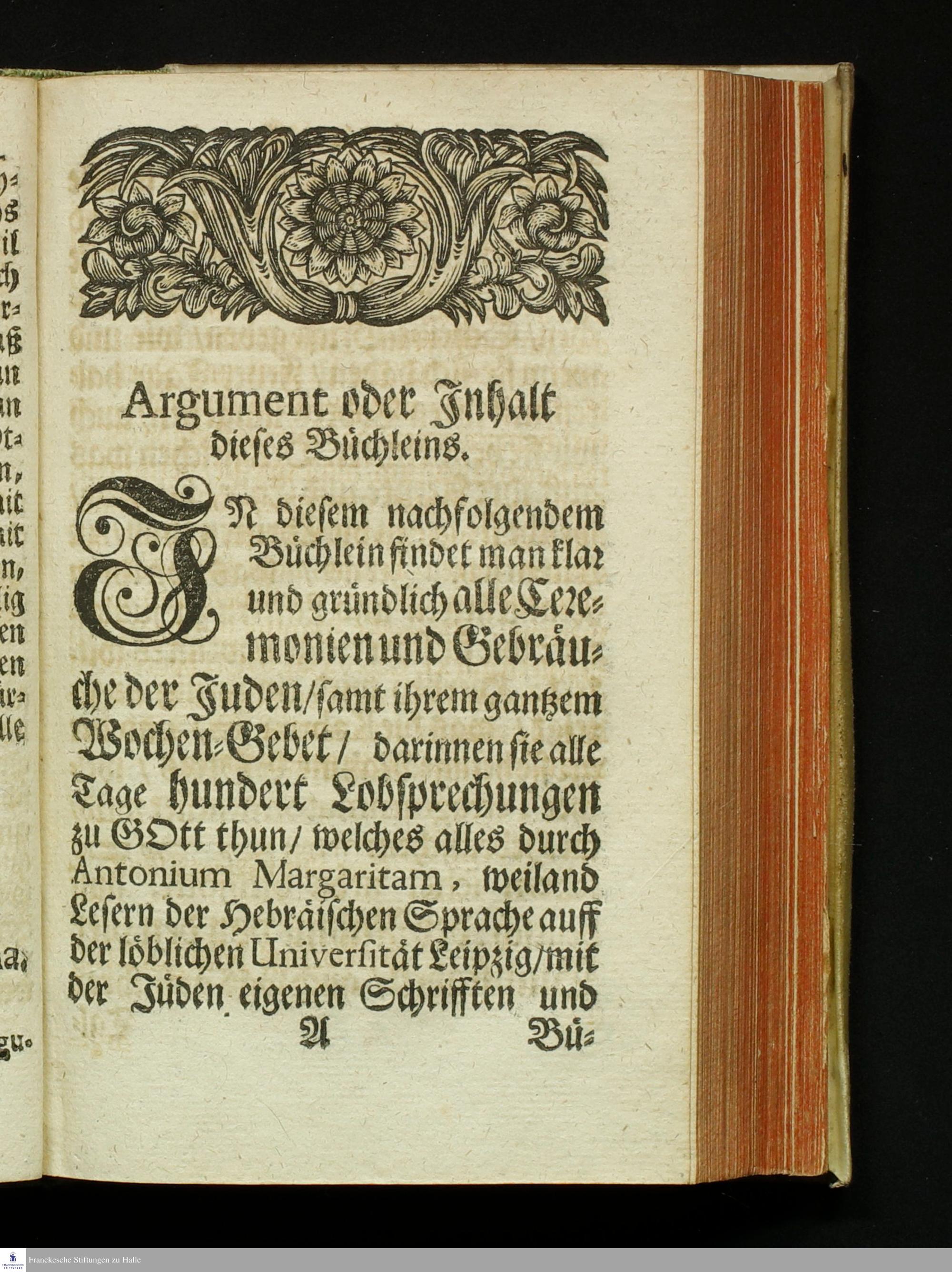 Der gantze Jüdische Glaube : Mit samt einer gründlichen und wahrhafftigen Anzeigung aller Satzungen, Ceremonien, Gebeten, heimlich- und öffentlichen Gebräuchen, deren sich die Jüden das gantze Jahr über bedienen : nebst schönen und gegründeten Argumenten wider ihren Glauben / beschrieben und zusammen getragen von Antonio Margaritha, einem bekehrten Jüden/ und weiland Lectore oder Lesern der Hebräischen Sprache bey der Hochlöbl. Universität Leipzig