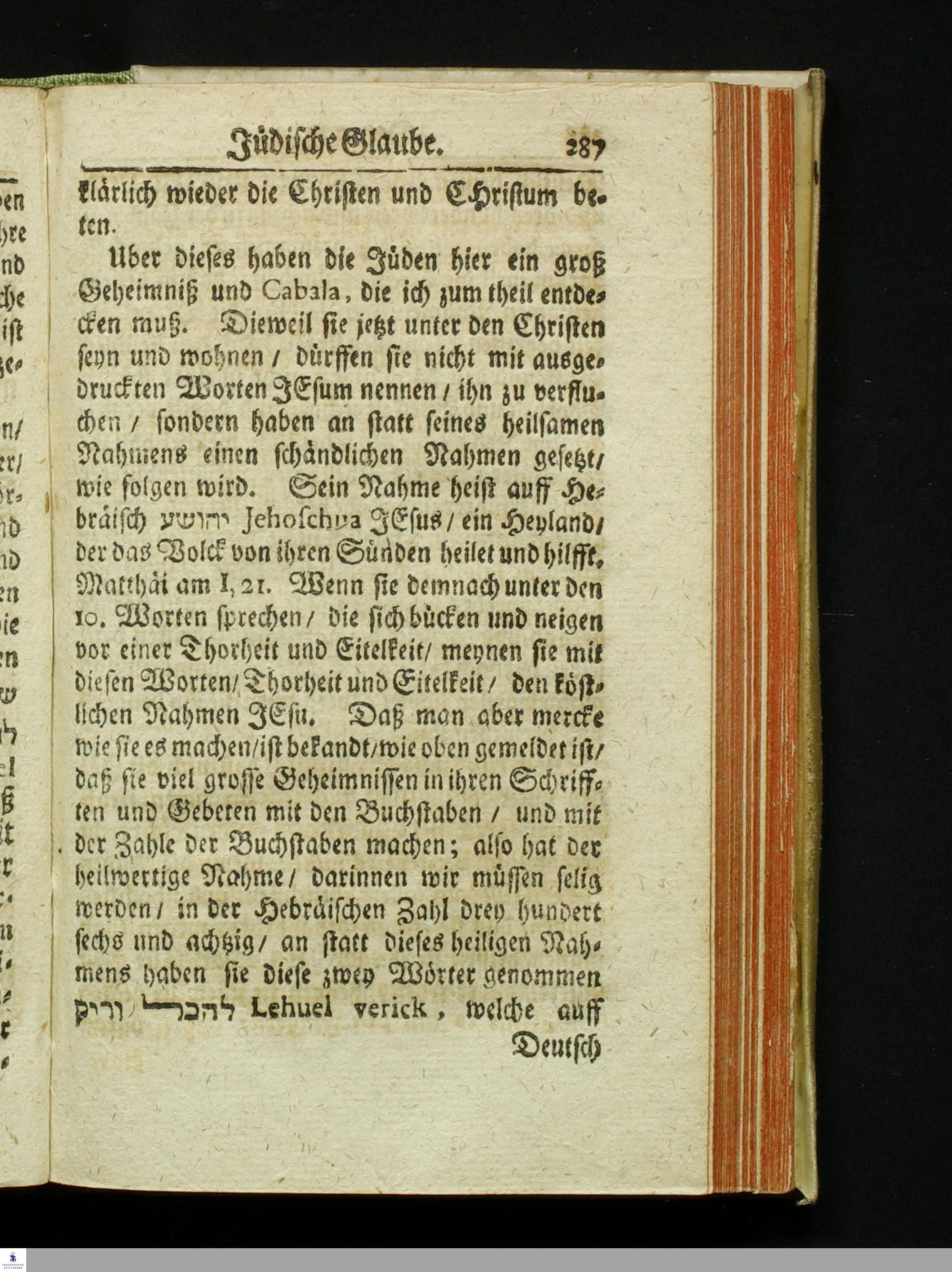 Der gantze Jüdische Glaube : Mit samt einer gründlichen und wahrhafftigen Anzeigung aller Satzungen, Ceremonien, Gebeten, heimlich- und öffentlichen Gebräuchen, deren sich die Jüden das gantze Jahr über bedienen : nebst schönen und gegründeten Argumenten wider ihren Glauben / beschrieben und zusammen getragen von Antonio Margaritha, einem bekehrten Jüden/ und weiland Lectore oder Lesern der Hebräischen Sprache bey der Hochlöbl. Universität Leipzig