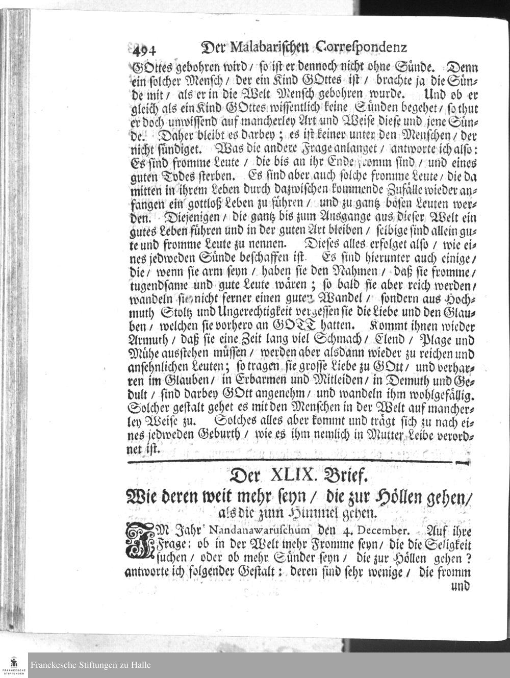 Der [Malabarischen Correspondenz] XLIX. Brief. Wie deren weit mehr seyn/ die zur...